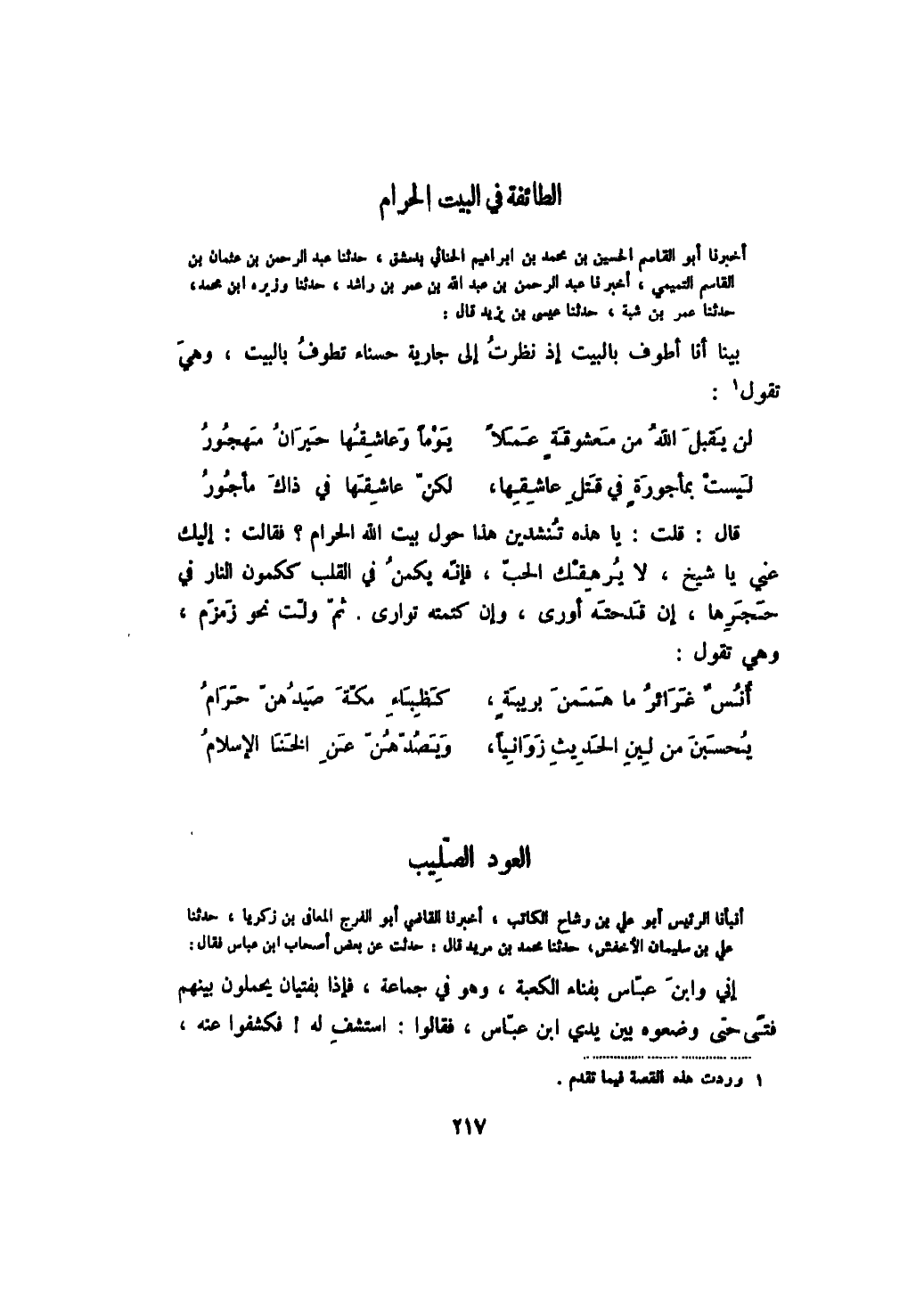 أخبرنا أبو القاسم الحسين بن محمد بن إبراهيم الحنائي بدمشق، حدثنا عبد الرحمن بن عثمان بن القاسم التميمي، أخبرنا عبد الرحمن بن عبد الله بن عمر بن راشد، حدثنا وزيره ابن محمد، حدثنا عمر بن شبة، حدثنا عيسى بن يزيد قال: بينا أنا أطوف بالبيت إذ نظرت إلى جارية حسناء تطوف بالبيت، وهي تقول:
