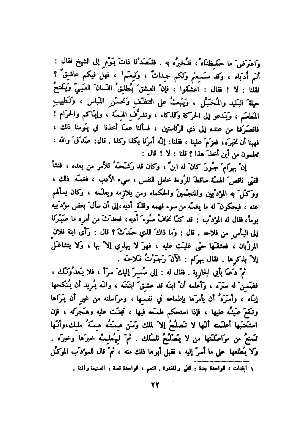 واعترض ما حفظناه، فنخبره به. فقصدنا ذات يوم إلى الشيخ فقال: أنتم أدباء، وقد سمعتم ولكم جدات، ونعم، فهل فيكم عاشق؟ فقلنا: لا! فقال: اعشقوا، فإن العشق يطلق اللسان العيي ويفتح حيلة البليد والمخبل، ويبعث على التنظف وتحسن اللباس، وتطييب المطعم، ويدعو إلى الحركة والذكاء، وتشرف الهمة، وإياكم والحرام! فانصرفنا من عنده إلى ذي الرئاستين، فسألنا عما أخذنا في يومنا ذلك، فهبنا أن نخبره، فعزم علينا، فقلنا: إنه أمرنا بكذا وكذا. قال: صدق والله، تعلمون من أين أخذ هذا؟ قلنا: لا! قال: إن بهرام جور كان له ابن، وكان قد رشحه للأمر من بعده، فنشأ الفتى ناقص الهمة ساقط المروءة خامل النفس، سيء الأدب، فغمه ذلك، ووكل به المؤدبين والمنجمين والحكماء ومن يلازمه ويعلمه، وكان يسألهم عنه، فيحكمون له ما يغمه من سوء فهمه وقلة أدبه، إلى أن سأل بعض مؤدبيه يوماً، فقال له المؤدب: قد كنا نخاف سوء أدبه، فحدث من أمره ما صيرنا إلى اليأس من فلاحه. قال: وما ذاك الذي حدث؟ قال: رأى ابنة فلان المرزبان، فعشقها حتى غلبت عليه، فهو لا يهذي إلا بها، ولا يتشاغل إلا بذكرها. فقال بهرام: الآن رجوت فلاحه.