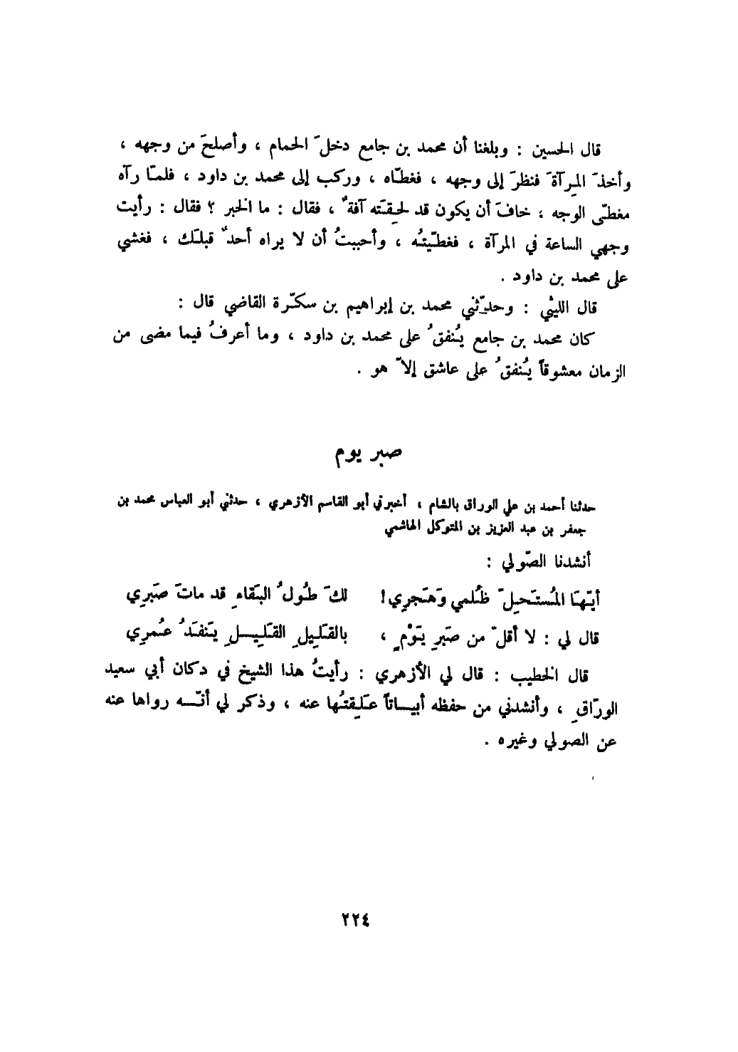 حدثنا أحمد بن علي الوراق بالشام، أخبرني أبو القاسم الأزهري، حدثني أبو العباس محمد بن جعفر بن عبد العزيز بن المتوكل الهاشمي: أنشدنا الصولي: