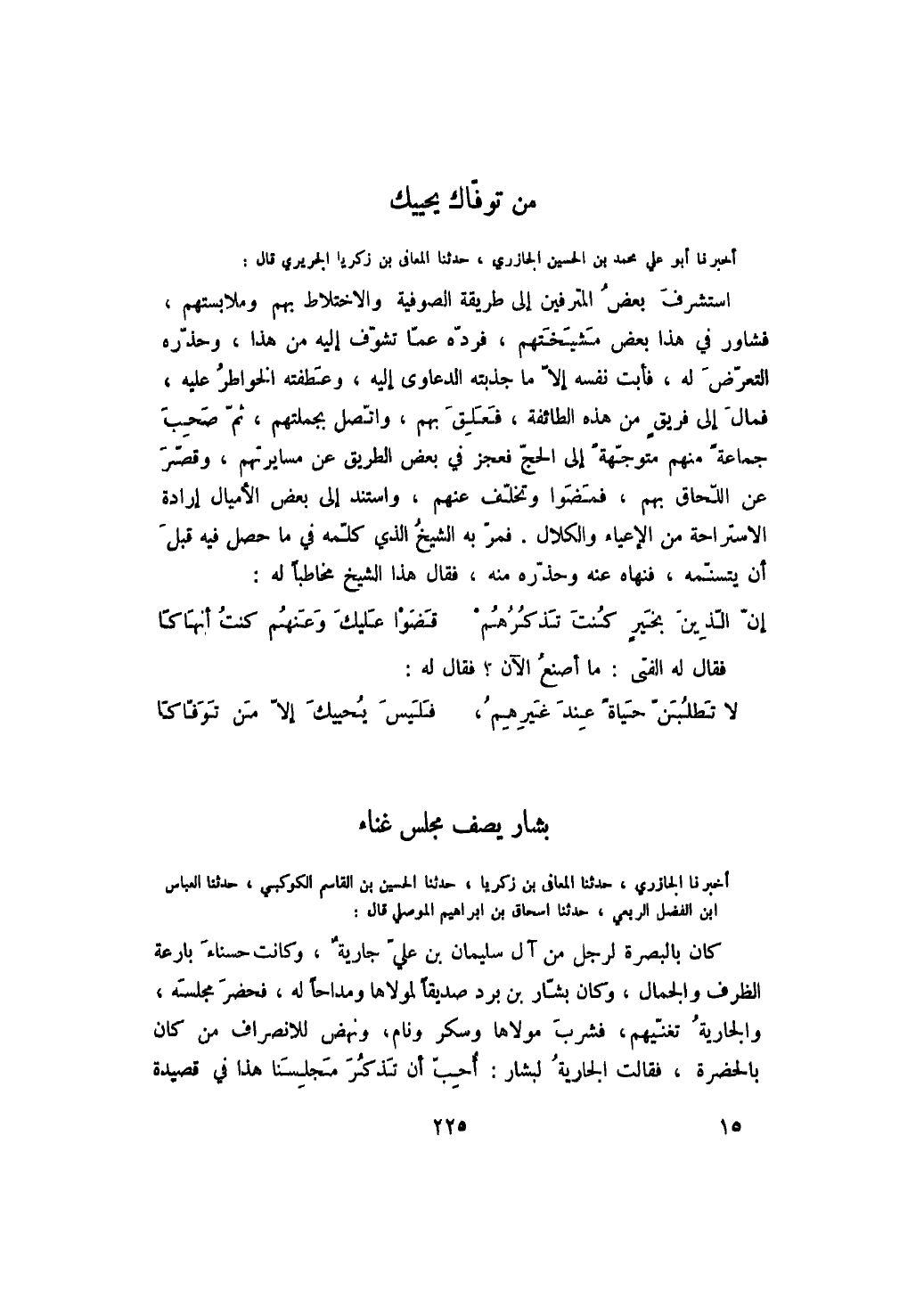 أخبرنا أبو علي محمد بن الحسين الجازري، حدثنا المعافى بن زكريا الجريري قال: استشرف بعض المترفين إلى طريقة الصوفية والاختلاط بهم وملابستهم، فشاور في هذا بعض مشيختهم، فرده عما تشوف إليه من هذا، وحذره التعرض له، فأبت نفسه إلا ما جذبته الدعاوى إليه، وعطفته الخواطر عليه، فمال إلى فريق من هذه الطائفة، فعلق بهم، واتصل بجملتهم، ثم صحب جماعةً منهم متوجهةً إلى الحج فعجز في بعض الطريق عن مسايرتهم، وقصر عن اللحاق بهم، فمضوا وتخلف عنهم، واستند إلى بعض الأميال إرادة الاستراحة من الإعياء والكلال. فمر به الشيخ الذي كلمه في ما حصل فيه قبل أن يتسنمه، فنهاه عنه وحذره منه، فقال هذا الشيخ مخاطباً له: