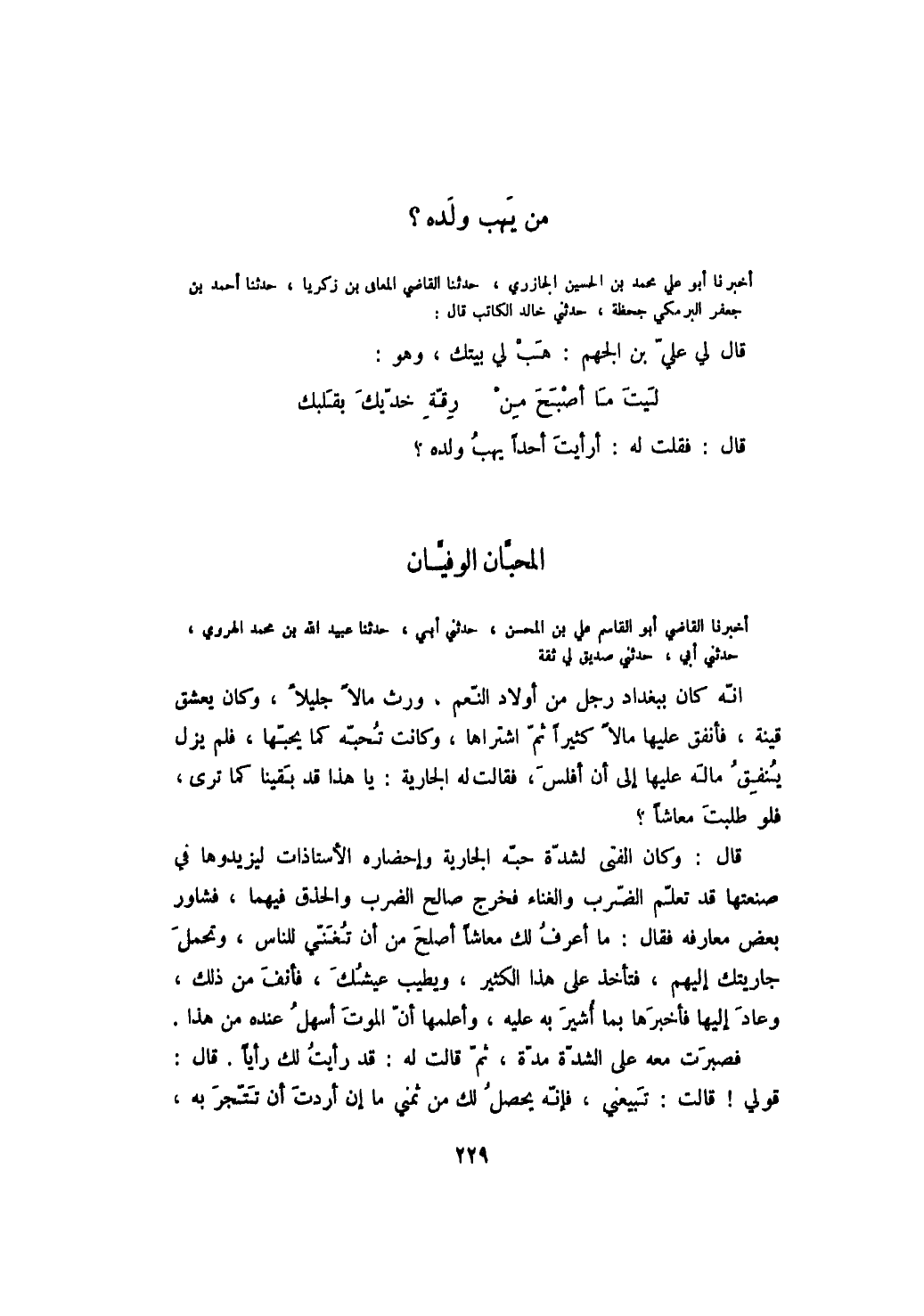 أخبرنا القاضي أبو القاسم علي بن المحسن، حدثني أبي، حدثنا عبيد الله بن محمد الهروي، حدثني أبي، حدثني صديق لي ثقة: أنه كان ببغداد رجل من أولاد النعم، ورث مالاً جليلاً، وكان يعشق قينة، فأنفق عليها مالاً كثيراً ثم اشتراها، وكانت تحبه كما يحبها، فلم يزل ينفق ماله عليها إلى أن أفلس، فقالت له الجارية: يا هذا قد بقينا كما ترى، فلو طلبت معاشاً؟ قال: وكان الفتى لشدة حبه الجارية وإحضاره الأستاذات ليزيدوها في صنعتها قد تعلم الضرب والغناء فخرج صالح الضرب والحذق فيهما، فشاور بعض معارفه فقال: ما أعرف لك معاشاً أصلح من أن تغني للناس، وتحمل جاريتك إليهم، فتأخذ على هذا الكثير، ويطيب عيشك، فأنف من ذلك، وعاد إليها فأخبرها بما أشير به عليه، وأعلمها أن الموت أسهل عنده من هذا. فصبرت معه على الشدة مدة، ثم قالت له: قد رأيت لك رأياً. قال: قولي! قالت: تبيعني، فإنه يحصل لك من ثمني ما إن أردت أن تتجر به،