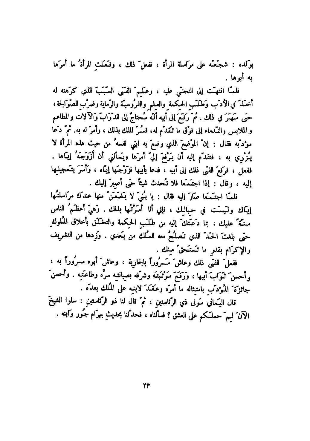 قال اليماني مولى ذي الرئاستين، ثم قال لنا ذو الرئاستين: سلوا الشيخ الآن لم حملكم على العشق؟ فسألناه، فحدثنا بحديث بهرام جور وابنه.