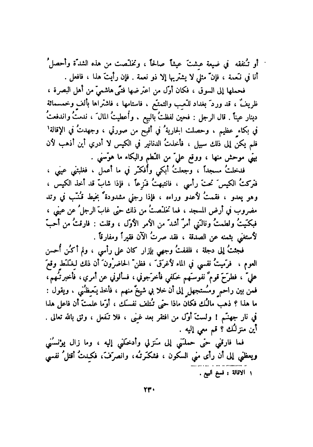 فحملها إلى السوق، فكان أول من اعترضها فتىً هاشمي من أهل البصرة، ظريف، قد ورد بغداد للعب والتمتع، فاستامها، فاشتراها بألف وخمسمائة دينار عيناً. قال الرجل: فحين لفظت بالبيع، وأعطيت المال، ندمت واندفعت في بكاء عظيم، وحصلت الجارية في أقبح من صورتي، وجهدت في الإقالة فلم يكن إلى ذلك سبيل، فأخذت الدنانير في الكيس لا أدري أين أذهب لأن بيتي موحش منها، ووقع علي من اللطم والبكاء ما هوّسني.