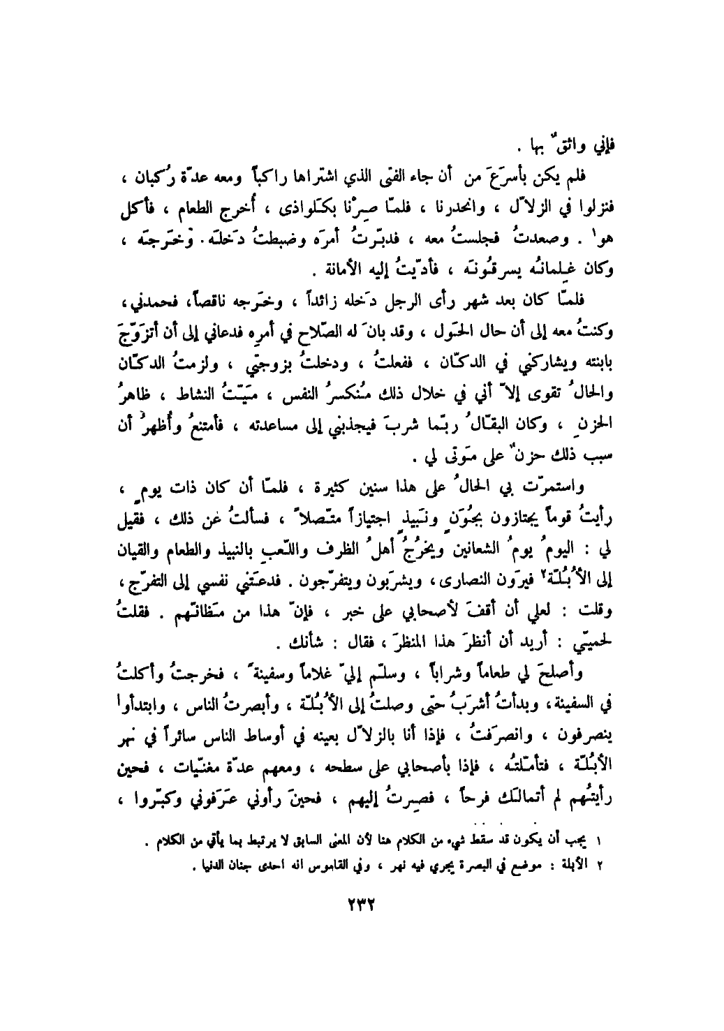 واستمرت بي الحال على هذا سنين كثيرة، فلما أن كان ذات يوم، رأيت قوماً يجتازون بجون ونبيذ اجتيازاً متصلاً، فسألت عن ذلك، فقيل لي: اليوم يوم الشعانين ويخرج أهل الظرف واللعب بالنبيذ والطعام والقيان إلى الأبلّة فيرون النصارى، ويشربون ويتفرجون. فدعتني نفسي إلى التفرج، وقلت: لعلي أن أقف لأصحابي على خبر، فإن هذا من مظانهم، فقلت لحميي: أريد أن أنظر هذا المنظر، فقال: شأنك.