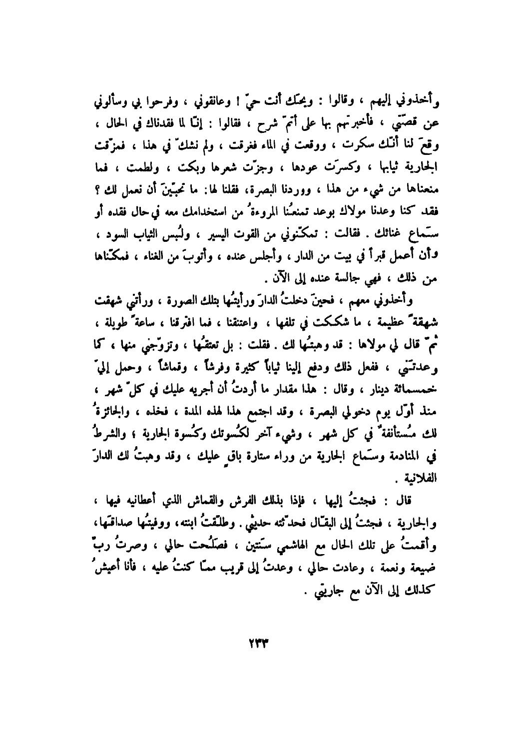 وأخذوني معهم، فحين دخلت الدار ورأيتها بتلك الصورة، ورأتني شهقت شهقة عظيمة، ما شككت في تلفها، واعتنقنا، فما افترقنا، ساعةً طويلة، ثم قال لي مولاها: قد وهبتها لك. فقلت: بل تعتقها، وتزوجني منها، كما وعدتني، ففعل ذلك ودفع إلينا ثياباً كثيرة وفرشاً، وقماشاً، وحمل إلي خمسمائة دينار، وقال: هذا مقدار ما أردت أن أجريه عليك في كل شهر، منذ أول يوم دخولي البصرة، وقد اجتمع هذا لهذه المدة، فخذه، والجائزة لك مستأنفة في كل شهر، وشيء آخر لكسوتك وكسوة الجارية؛ والشرط في المنادمة وسماع الجارية من وراء ستارة باق عليك، وقد وهبت لك الدار الفلانية.