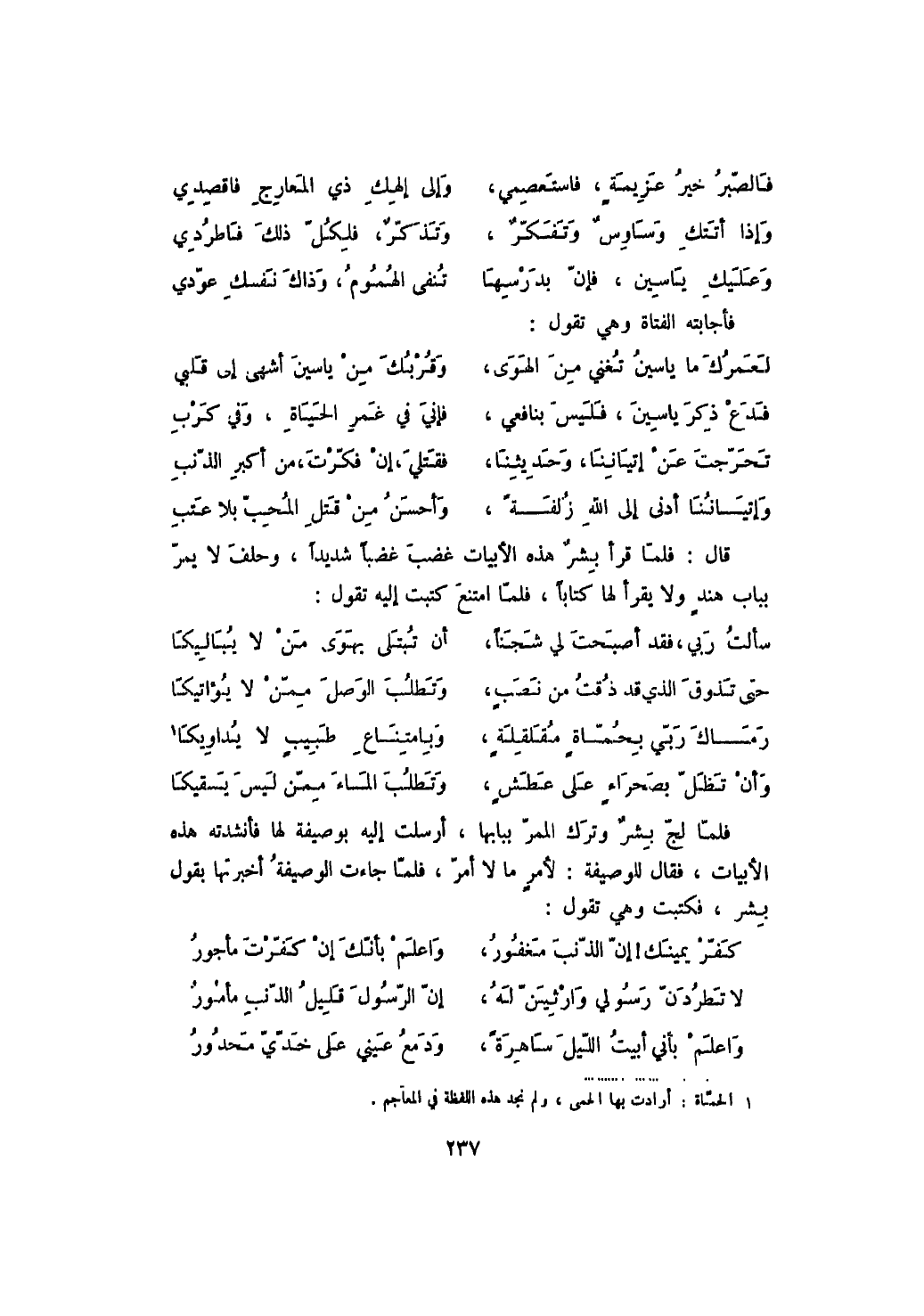فلما لج بشر وترك الممر ببابها، أرسلت إليه بوصيفة لها فأنشدته هذه الأبيات، فقال للوصيفة: لأمر ما لا أمر، فلما جاءت الوصيفة أخبرتها بقول بشر، فكتبت وهي تقول: