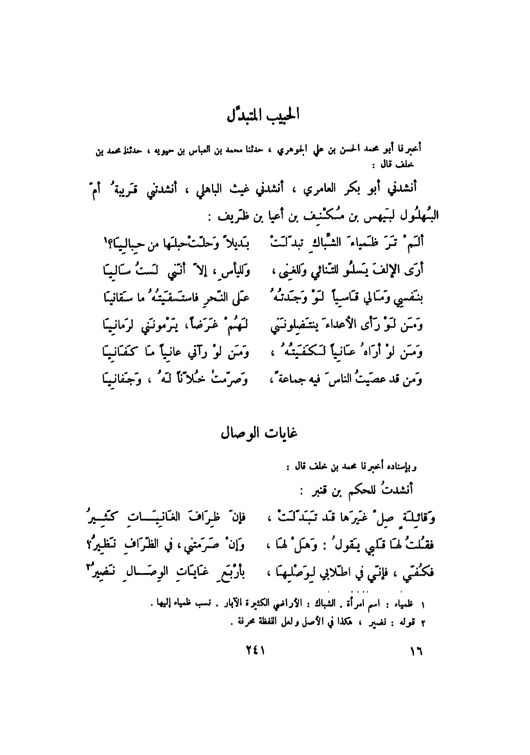 أخبرنا أبو محمد الحسن بن علي الجوهري، حدثنا محمد بن العباس بن حيويه، حدثنا محمد بن خلف قال: أنشدني أبو بكر العامري، أنشدني غيث الباهلي، أنشدتني قريبة أم البهلول لبيهس بن مكنف بن أعيا بن ظريف:
