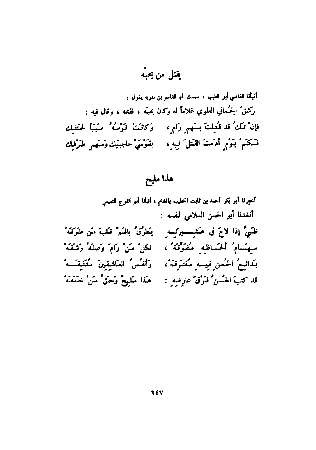 أنبأنا القاضي أبو الطيب، سمعت أبا القاسم بن متويه يقول: رشق الجماني العلوي غلاماً له وكان يحبه، فقتله، وقال فيه: