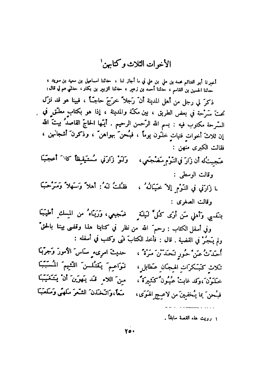 أخبرنا أبو الغنائم محمد بن علي بن علي في ما أجاز لنا، حدثنا إسماعيل بن سعيد بن سويد، حدثنا الحسين بن القاسم، حدثنا أحمد بن زهير، حدثنا الزبير بن بكار، حدثني عم لي قال: ذكر لي رجل من أهل المدينة أن رجلاً خرج حاجاً، فبينا هو قد نزل تحت سرحة في بعض الطريق، بين مكة والمدينة، إذا هو بكتاب معلق في السرحة مكتوب فيه: بسم الله الرحمن الرحيم. أيها الحاج القاصد بيت الله إن ثلاث أخوات فتيات خلون يوماً، فبحن بهواهن، وذكرن أشجانهن، فقالت الكبرى منهن: