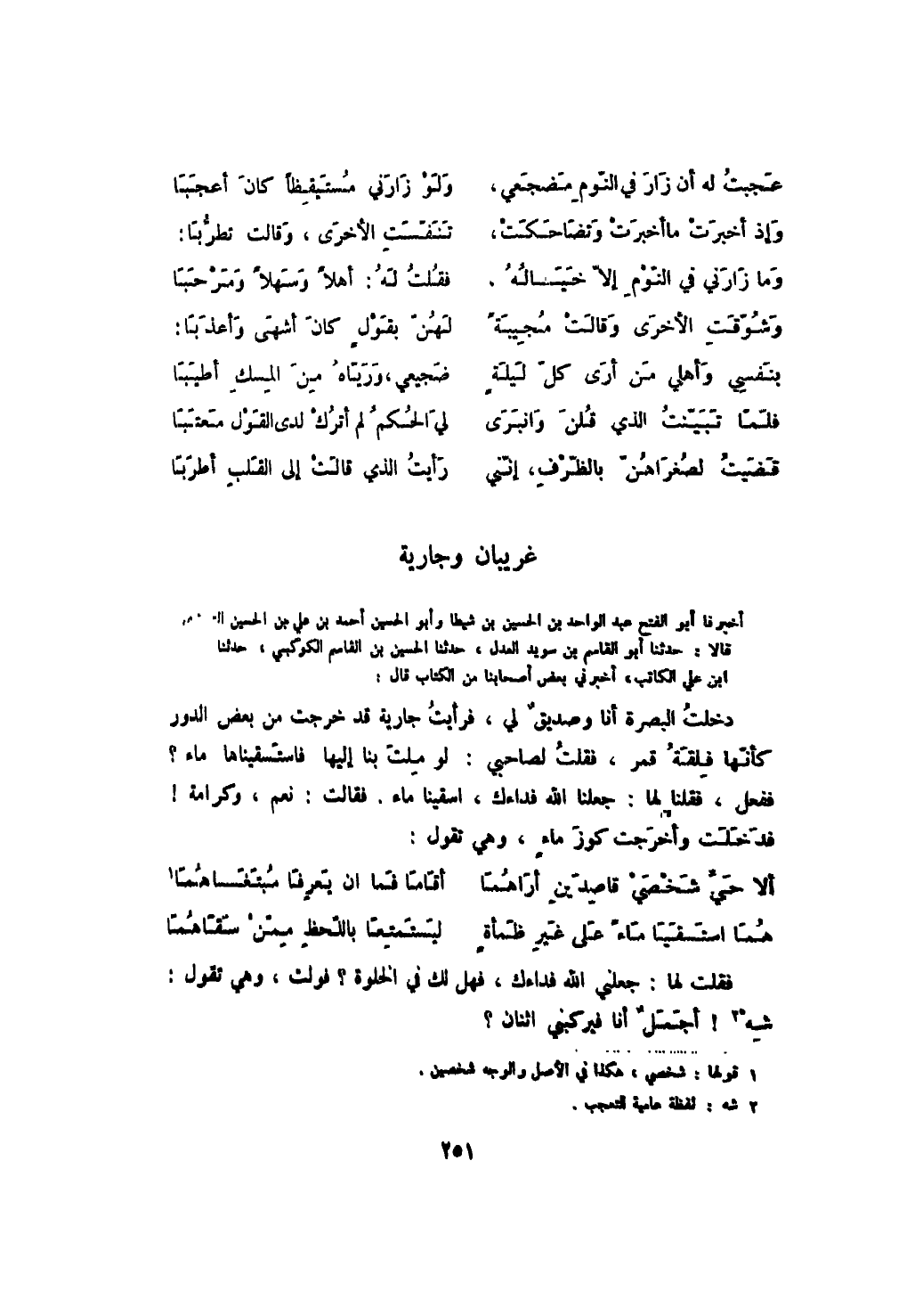 أخبرنا أبو الفتح عبد الواحد بن الحسين بن شيطا وأبو الحسين أحمد بن علي بن الحسين قالا: حدثنا أبو القاسم بن سويد العدل، حدثنا الحسين بن القاسم الكوكبي، حدثنا ابن علي الكاتب، أخبرني بعض أصحابنا من الكتاب قال: دخلت البصرة أنا وصديق لي، فرأيت جارية قد خرجت من بعض الدور كأنها فلقة قمر، فقلت لصاحبي: لو ملت بنا إليها فاستسقيناها ماء؟ ففعل، فقلنا له: جعلنا الله فداءك، اسقينا ماء، فقالت: نعم، وكرامة! فدخلت وأخرجت كوز ماء، وهي تقول: