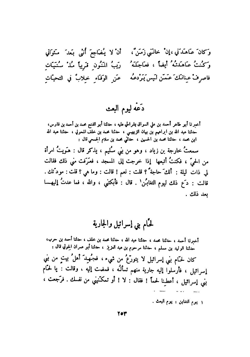 أخبرنا أبو طاهر أحمد بن علي السواق بقراءتي عليه، حدثنا أبو الفتح محمد بن أحمد بن فارس، حدثنا عبد الله بن إبراهيم بن بيان الزبيبي، حدثنا محمد بن خلف المحولي، حدثنا عبد الله بن محمد، حدثنا محمد بن الحسين، حدثني محمد بن سلام الجمحي قال: سمعت خارجة بن زياد، وهو من بني سليم، يذكر قال: هويت امرأة من الحي، فكنت أتبعها إذا خرجت إلى المسجد، فعرفت مني ذلك فقالت لي ذات ليلة: ألك حاجة؟ قلت: نعم! قالت: وما هي؟ قلت: مودتك. قالت: دع ذلك ليوم التغابن. قال: فأبكتني، والله فما عدت إليها بعد ذلك.