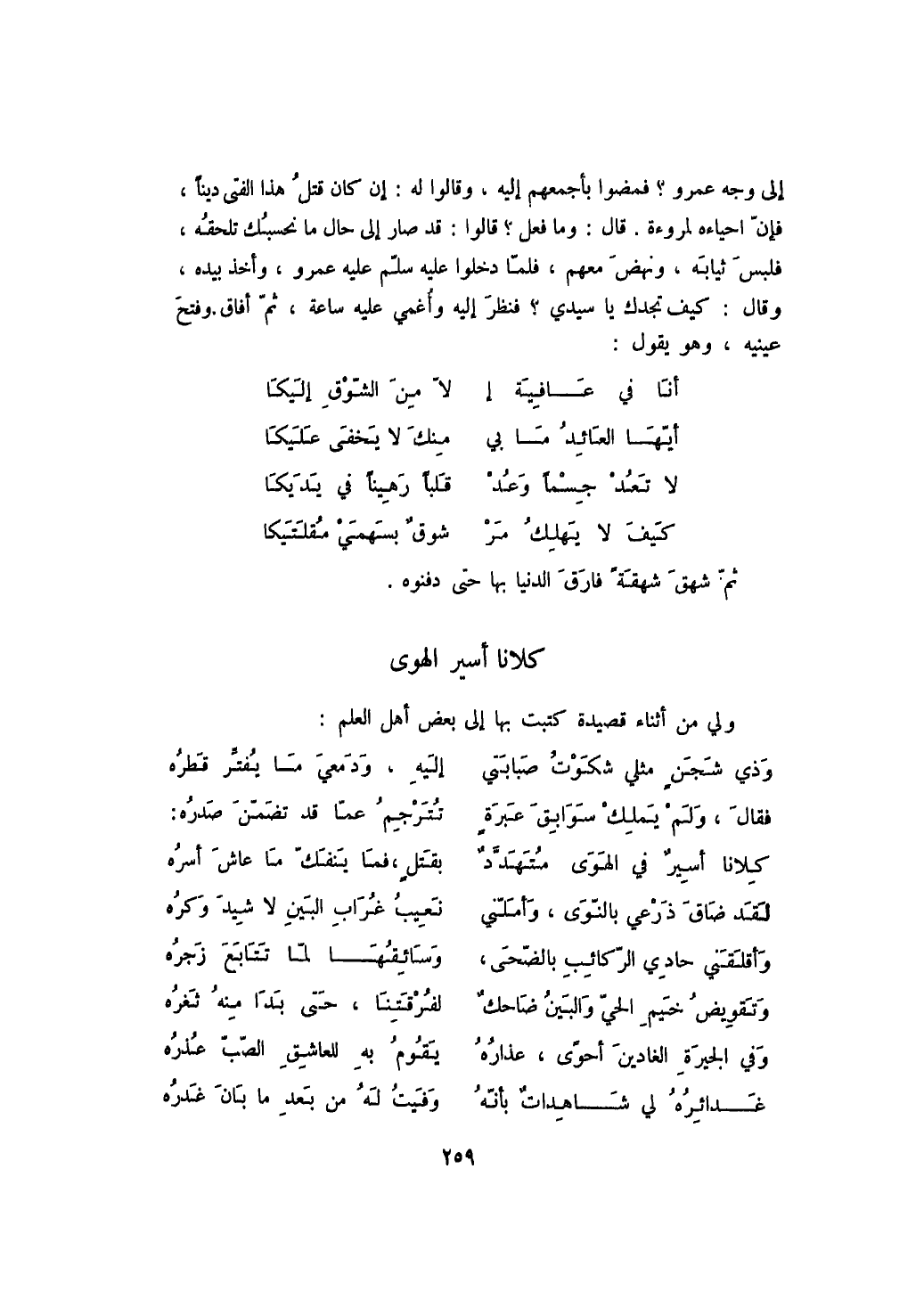 إلى وجه عمرو؟ فمضوا بأجمعهم إليه، وقالوا له: إن كان قتل هذا الفتى ديناً، فإن إحياؤه لمروءة. قال: وما فعل؟ قالوا: قد صار إلى حال ما نحسبك تلحقه، فلبس ثيابه، ونهض معهم، فلما دخلوا عليه سلم عليه عمرو، وأخذ بيده، وقال: كيف تجدك يا سيدي؟ فنظر إليه وأغمي عليه ساعة، ثم أفاق وفتح عينيه، وهو يقول: