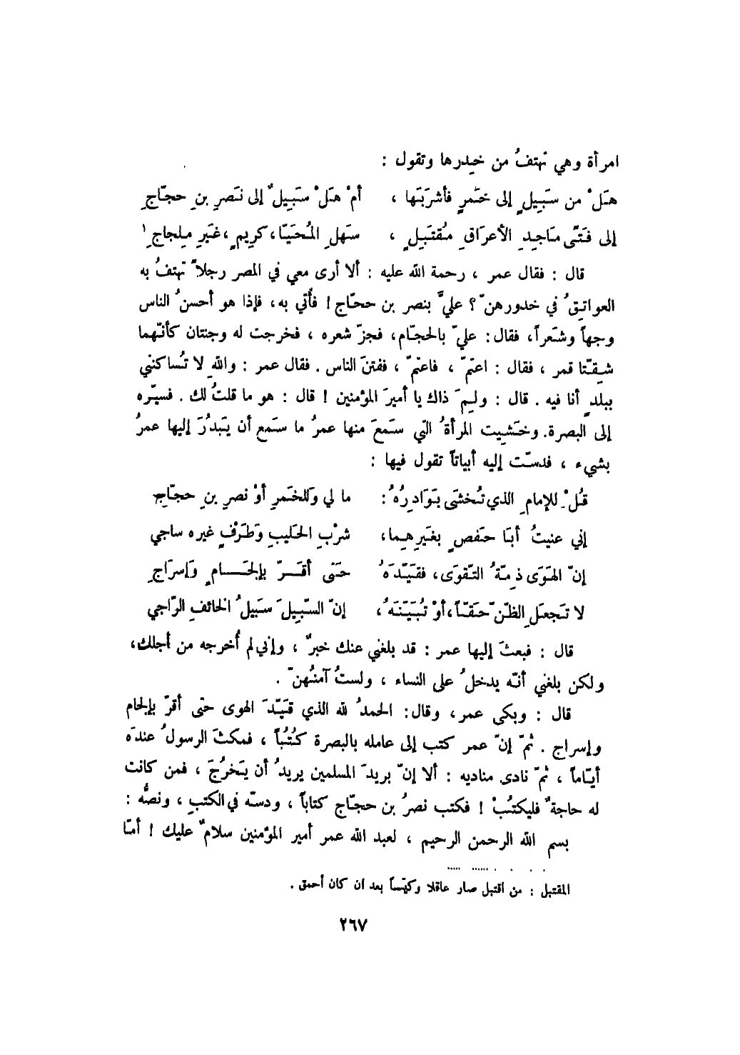 قال: وبكى عمر، وقال: الحمد لله الذي قيد الهوى حتى أقر بإلجام وإسراج. ثم إن عمر كتب إلى عامله بالبصرة كتباً، فمكث الرسول عنده أياماً، ثم نادى مناديه: الا إن بريد المسلمين يريد أن يخرج، فمن كانت له حاجة فليكتب! فكتب نصر بن حجاج كتاباً، ودسه في الكتب، ونصه: بسم الله الرحمن الرحيم، لعبد الله عمر أمير المؤمنين سلام عليك! أما