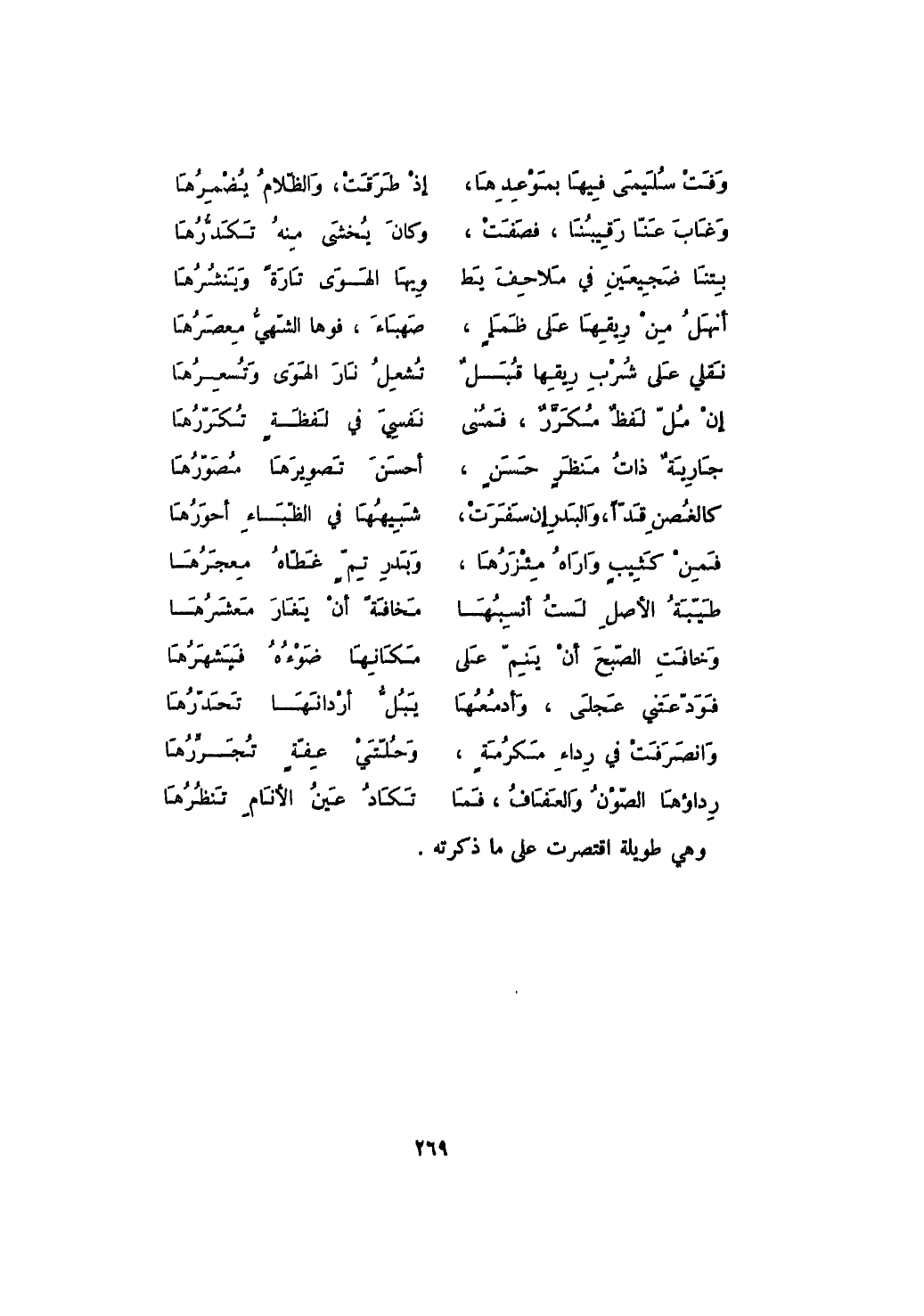 وَفَتْ سُلَيمَى فِيهَا بمَوْعِدِها، ... إذْ طَرَقَتْ، وَالظّلامُ يُضْمِرُهَا