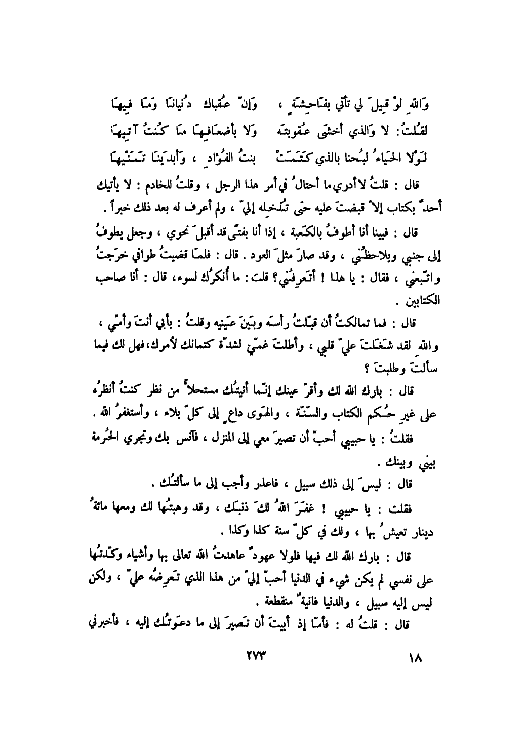 قال: فبينا أنا أطوف بالكعبة، إذا أنا بفتى قد أقبل نحوي، وجعل يطوف إلى جنبي ويلاحظني، وقد صار مثل العود. قال: فلما قضيت طوافي خرجت واتبعني، فقال: يا هذا! أتعرفني؟ قلت: ما أنكرك لسوء، قال: أنا صاحب الكتابين.