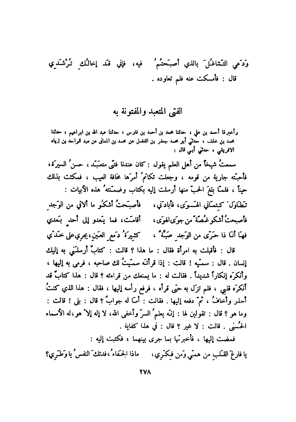 وأخبرنا أحمد بن علي، حدثنا محمد بن أحمد بن فارس، حدثنا عبد الله بن إبراهيم، حدثنا محمد بن خلف، حدثني أبو محمد جعفر بن الفضل بن محمد بن المعافى عن عبد الواحد بن زياد الافريقي، حدثني أبي قال: سمعت شيخاً من أهل العلم يقول: كان عندنا فتىً متعبد، حسن السيرة، فأحبته جارية من قومه، وجعلت تكاتم أمرها مخافة العيب، فمكثت بذلك حيناً، فلما بلغ الحب منها أرسلت إليه بكتاب وضمنته هذه الأبيات: