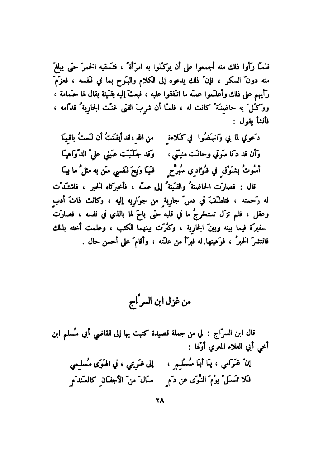 قال ابن السراج: لي من جملة قصيدة كتبت بها إلى القاضي أبي مسلم ابن أخي أبي العلاء المعري أولها: