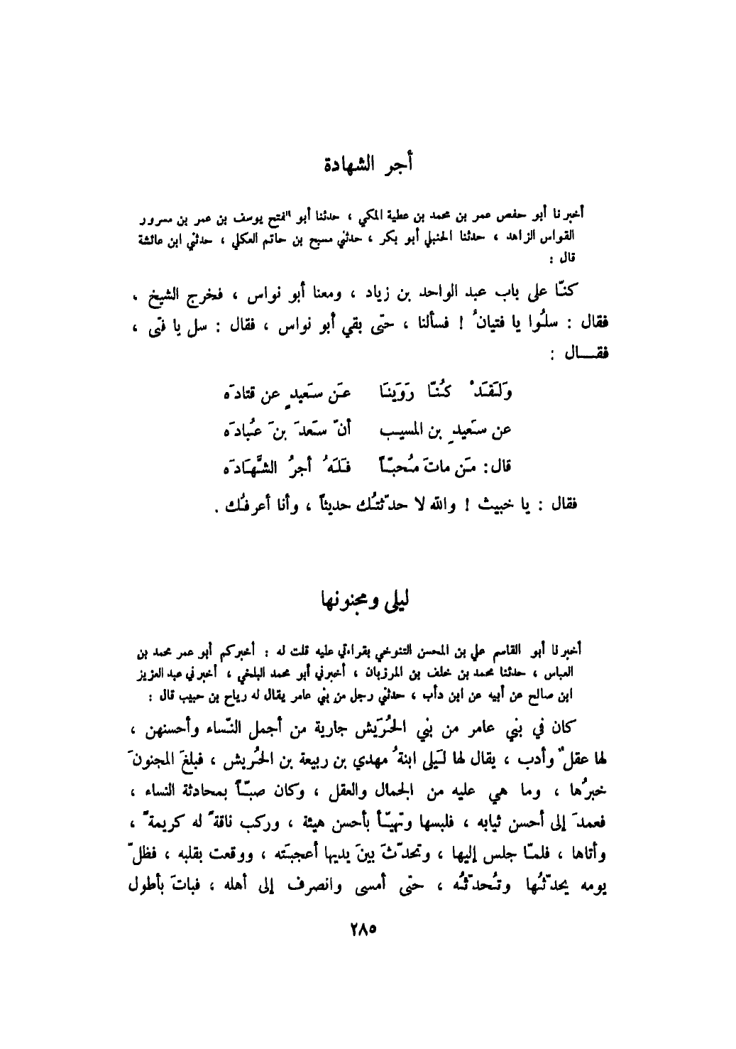 أخبرنا أبو القاسم علي بن المحسن التنوخي بقراءتي عليه قلت له: أخبركم أبو عمر محمد بن العباس، حدثنا محمد بن خلف بن المرزبان، أخبرني أبو محمد البلخي، أخبرني عبد العزيز بن صالح عن أبيه عن ابن دأب، حدثني رجل من بني عامر يقال له رياح بن حبيب قال: