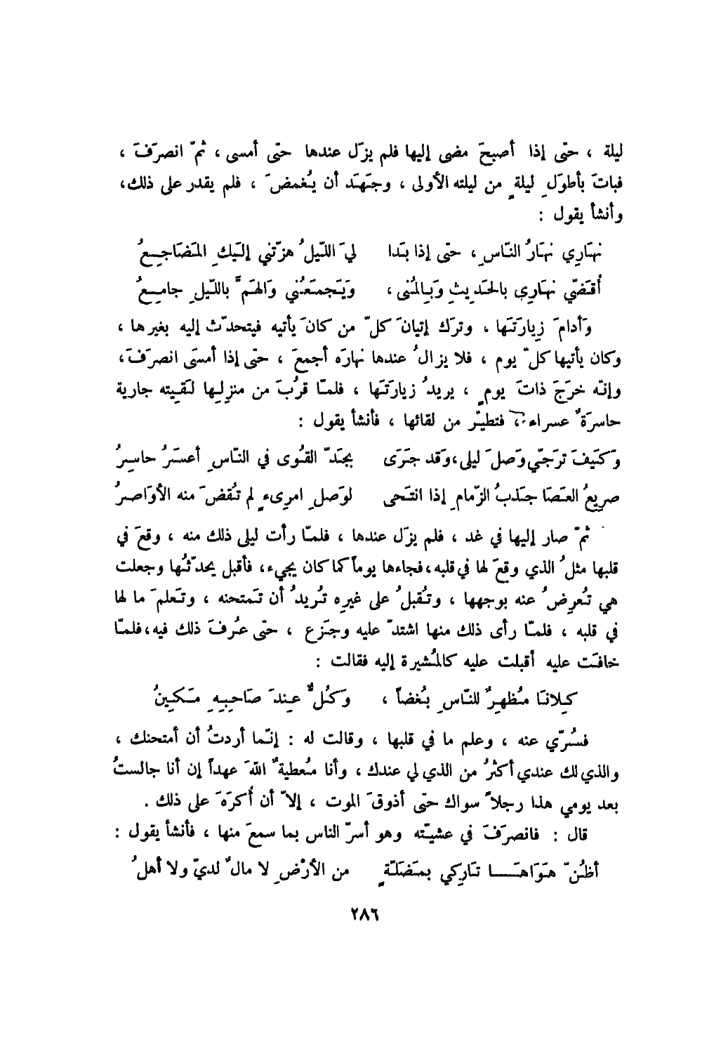 ثم صار إليها في غد، فلم يزل عندها، فلما رأت ليلى ذلك منه، وقع في قلبها مثل الذي وقع لها في قلبه، فجاءها يوماً كما كان يجيء، فأقبل يحدثها وجعلت هي تعرض عنه بوجهها، وتقبل على غيره تريد أن تمتحنه، وتعلم ما لها في قلبه، فلما رأى ذلك منها اشتد عليه وجزع، حتى عرف ذلك فيه، فلما خافت عليه أقبلت عليه كالمشيرة إليه فقالت: