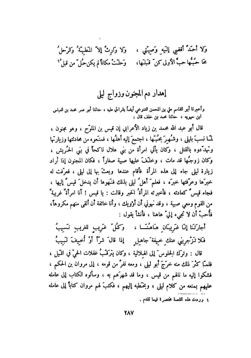 وأخبرنا أبو القاسم علي بن المحسن التنوخي أيضاً بقراءتي عليه، حدثنا أبو عمر محمد بن العباس بن حيويه، حدثنا محمد بن خلف قال: قال أبو عبد الله محمد بن زياد الأعرابي إن قيس بن الملوح، وهو مجنون، لما نسب بليلى، وشهر بحبها، اجتمع إليه أهلها، فمنعوه من محادثتها وزيارتها، وتهددوه بالقتل، وكان يأتي امرأة من بني هلال ناكحاً في بني الحريش، وكان زوجها قد مات، وخلف عليها صبية صغاراً، فكان المجنون إذا أراد زيارة ليلى جاء إلى هذه المرأة فأقام عندها وبعث بها إلى ليلى، فعرفت له خبرها وعرفتها خبره، فعلم أهل ليلى بذلك فنهوها أن يدخل قيس إليها، فجاء قيس كعادته، فأخبرته المرأة الخبر وقالت: يا قيس! أنا امرأة غريبة من القوم ومعي صبية، وقد نهوني أن أؤويك، وأنا خائفة أن ألقى منهم مكروهاً، فأحب أن لا تجيء إلي هاهنا، فأنشأ يقول: