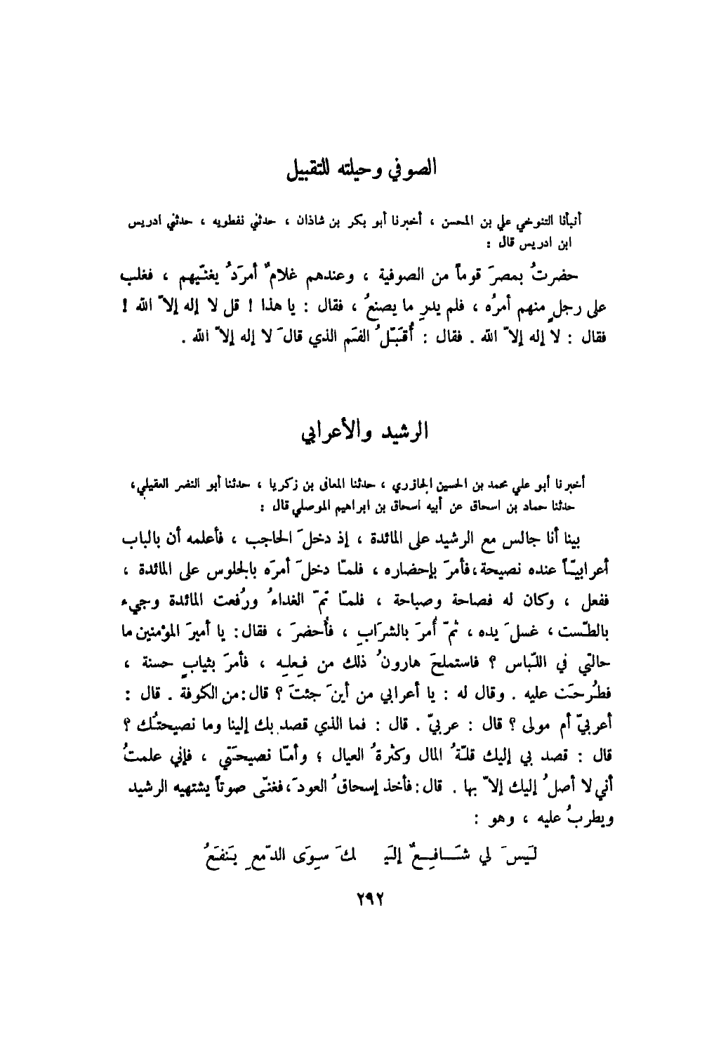 أخبرنا أبو علي محمد بن الحسين الجازري، حدثنا المعافى بن زكريا، حدثنا أبو النضر العقيلي، حدثنا حماد بن إسحق عن أبيه إسحق بن إبراهيم الموصلي قال: بينا أنا جالس مع الرشيد على المائدة، إذ دخل الحاجب، فأعلمه أن بالباب أعرابياً عنده نصيحة، فأمر بإحضاره، فلما دخل أمره بالجلوس على المائدة، ففعل، وكان له فصاحة وصباحة، فلما تم الغداء ورفعت المائدة وجيء بالطست، غسل يده، ثم أمر بالشراب، فأحضر، فقال: يا أمير المؤمنين ما حالتي في اللباس؟ فاستملح هارون ذلك من فعله، فأمر بثياب حسنة، فطرحت عليه. وقال له: يا أعرابي من أين جئت؟ قال: من الكوفة. قال: أعربي أم مولى؟ قال: عربي. قال: فما الذي قصد بك إلينا وما نصيحتك؟ قال: قصد بي إليك قلة المال وكثرة العيال؛ وأما نصيحتي، فإني علمت أني لا أصل إليك إلا بها. قال: فأخذ إسحق العود، فغنى صوتاً يشتهيه الرشيد ويطرب عليه، وهو: