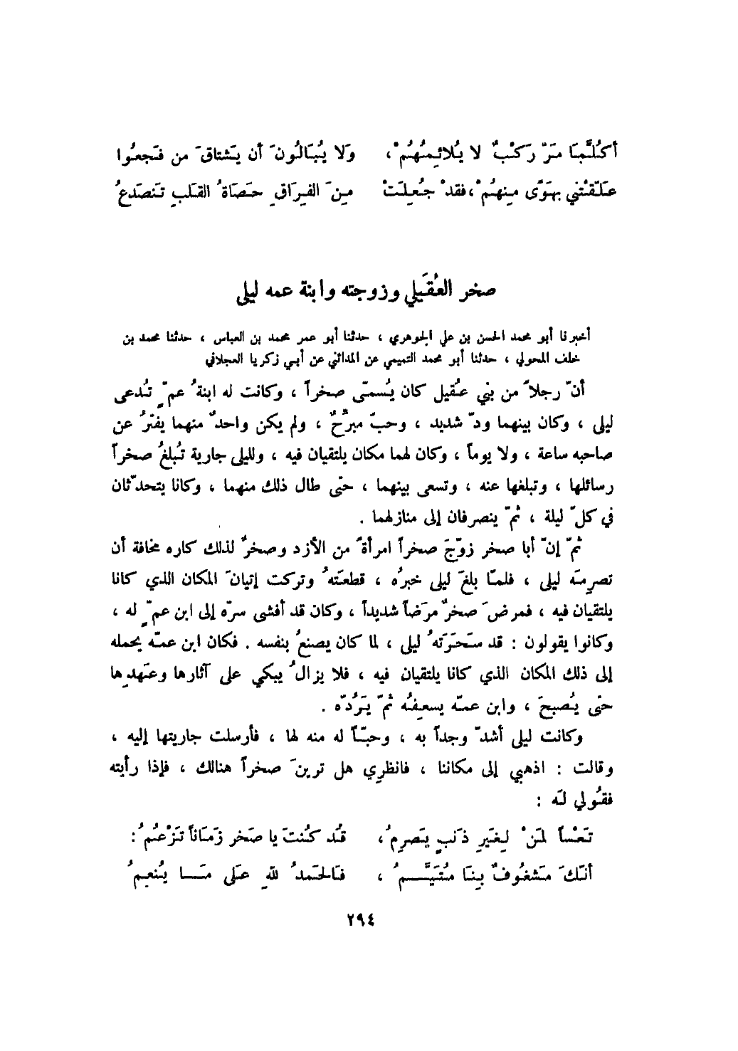 أخبرنا أبو محمد الحسن بن علي الجوهري، حدثنا أبو عمر محمد بن العباس، حدثنا محمد بن خلف المحولي، حدثنا أبو محمد التميمي عن المدائني عن أبي زكريا العجلاني أن رجلاً من بني عقيل كان يسمى صخراً، وكانت له ابنة عم تدعى ليلى، وكان بينهما ود شديد، وحب مبرح، ولم يكن واحد منهما يفتر عن صاحبه ساعة، ولا يوماً، وكان لهما مكان يلتقيان فيه، ولليلى جارية تبلغ صخراً رسائلها، وتبلغها عنه، وتسعى بينهما، حتى طال ذلك منهما، وكانا يتحدثان في كل ليلة، ثم ينصرفان إلى منازلهما.