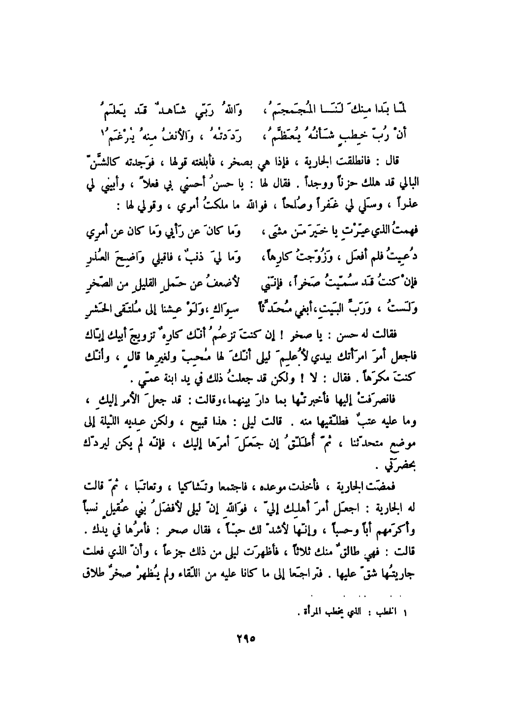 فقالت له حسن: يا صخر! إن كنت تزعم أنك كاره تزويج أبيك إياك فاجعل أمر امرأتك بيدي لأعلم ليلى أنك لها محب ولغيرها قال، وأنك كنت مكرهاً. فقال: لا! ولكن قد جعلت ذلك في يد ابنة عمي.