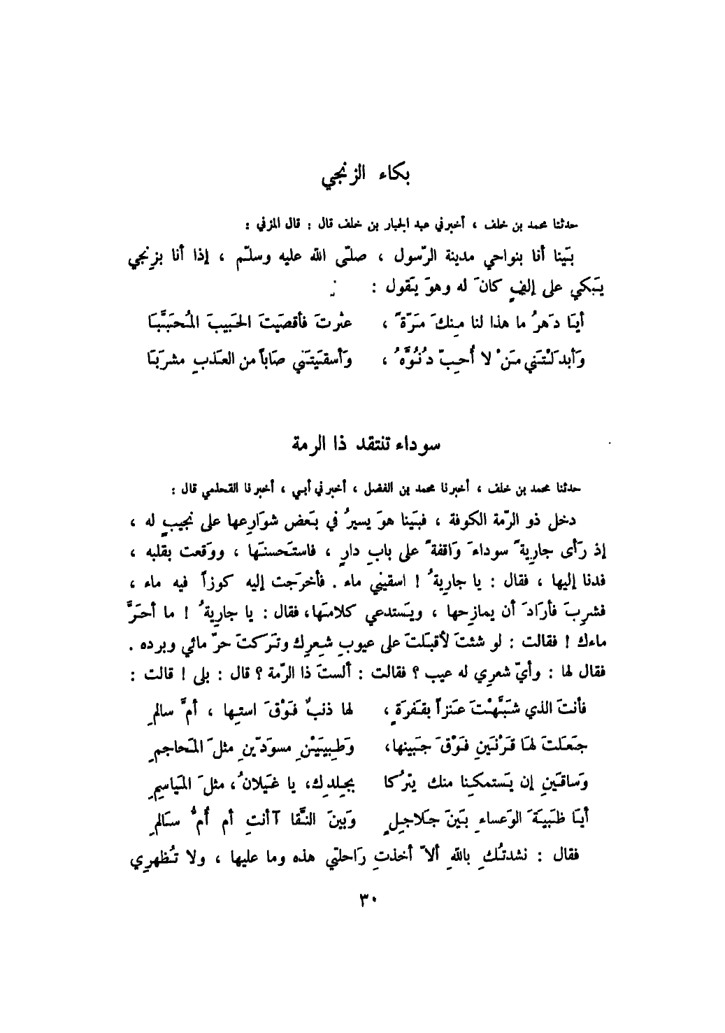 حدثنا محمد بن خلف، أخبرني عبد الجبار بن خلف قال: قال المزني: بينا أنا بنواحي مدينة الرسول، صلى الله عليه وسلم، إذا أنا بزنجي يبكي على إلف كان له وهو يقول: