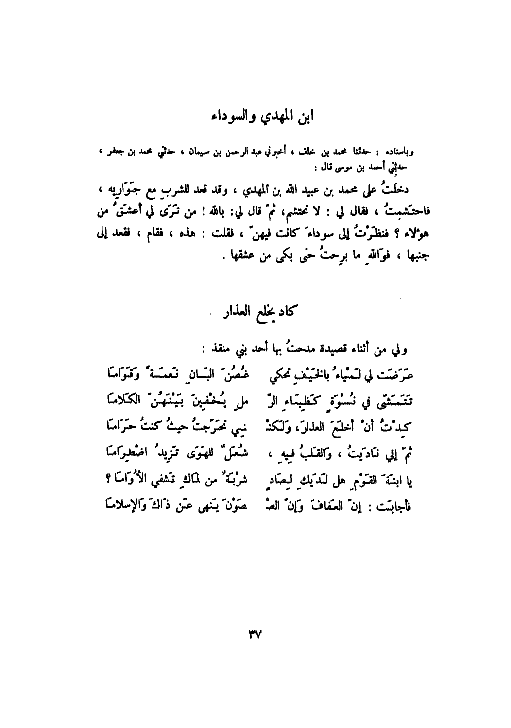 وبإسناده: حدثنا محمد بن خلف، أخبرني عبد الرحمن بن سليمان، حدثني محمد بن جعفر، حدثني أحمد بن موسى قال: دخلت على محمد بن عبيد الله بن المهدي، وقد قعد للشرب مع جواريه، فاحتشمت، فقال لي: لا تحتشم، ثم قال لي: بالله! من ترى لي أعشق من هؤلاء؟ فنظرت إلى سوداء كانت فيهن، فقلت: هذه، فقام، فقعد إلى جنبها، فوالله ما برحت حتى بكى من عشقها.