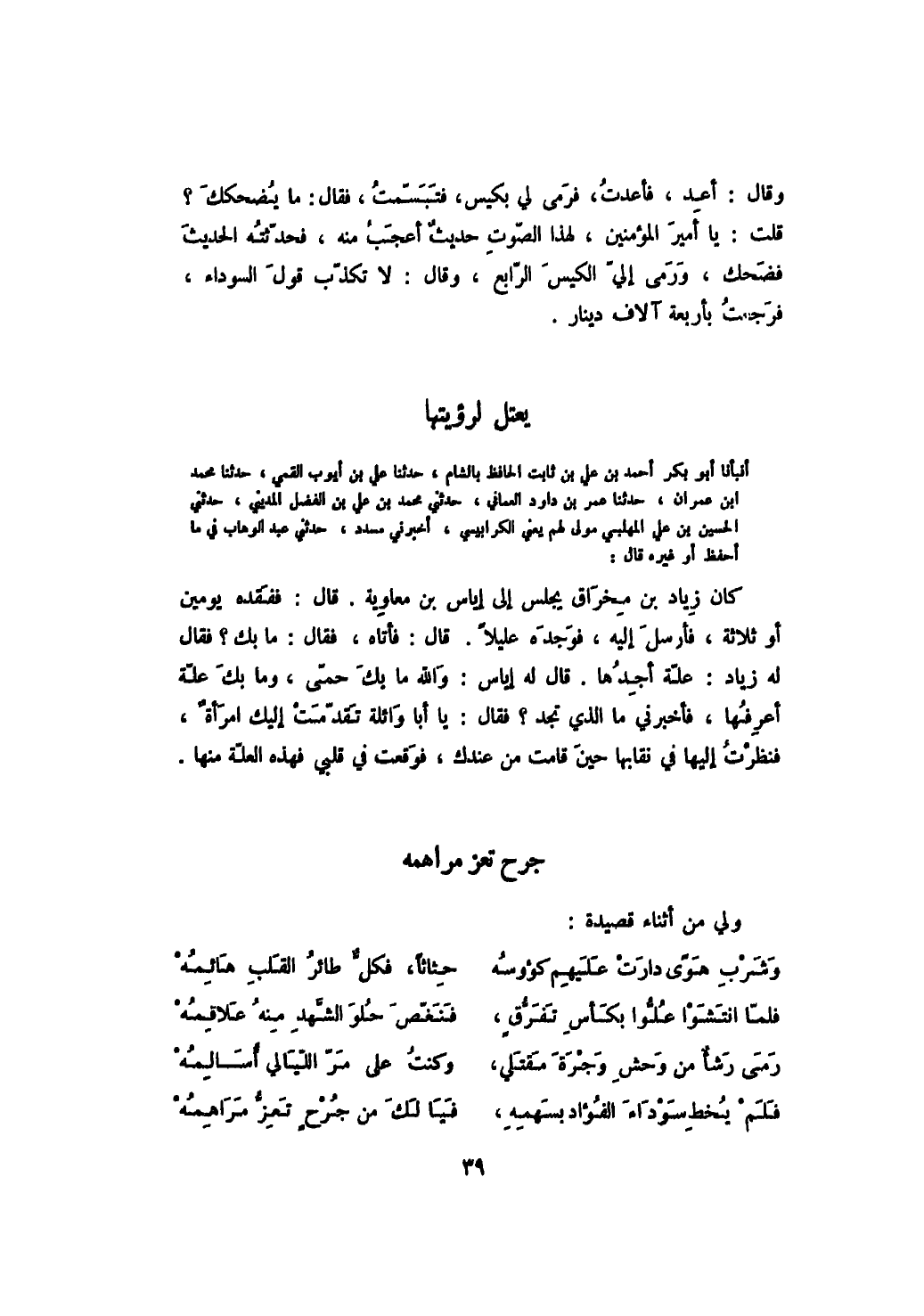 وقال: أعد، فأعدت، فرمى لي بكيس، فتبسمت، فقال: ما يضحكك؟ قلت: يا أمير المؤمنين، لهذا الصوت حديث أعجب منه، فحدثته الحديث فضحك، ورمى إلي الكيس الرابع، وقال: لا تكذب قول السوداء، فرجعت بأربعة آلاف دينار.