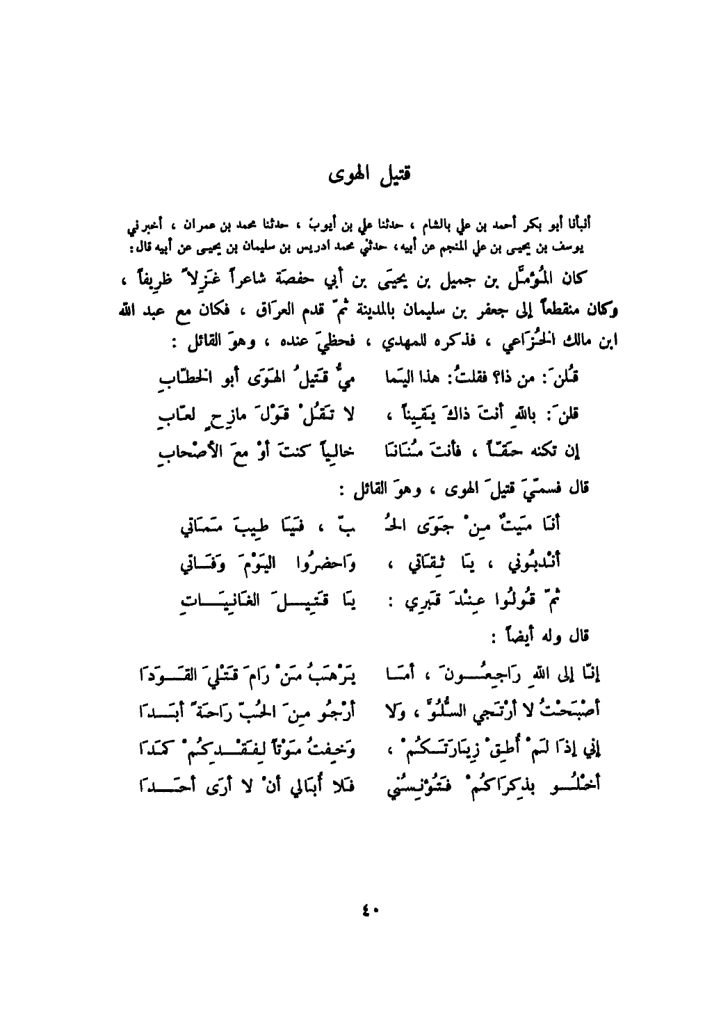 قُلْنَ: مَن ذا؟ فقلتُ: هذا اليَما ... ميُّ قَتيلُ الهَوَى أبو الخطّابِ