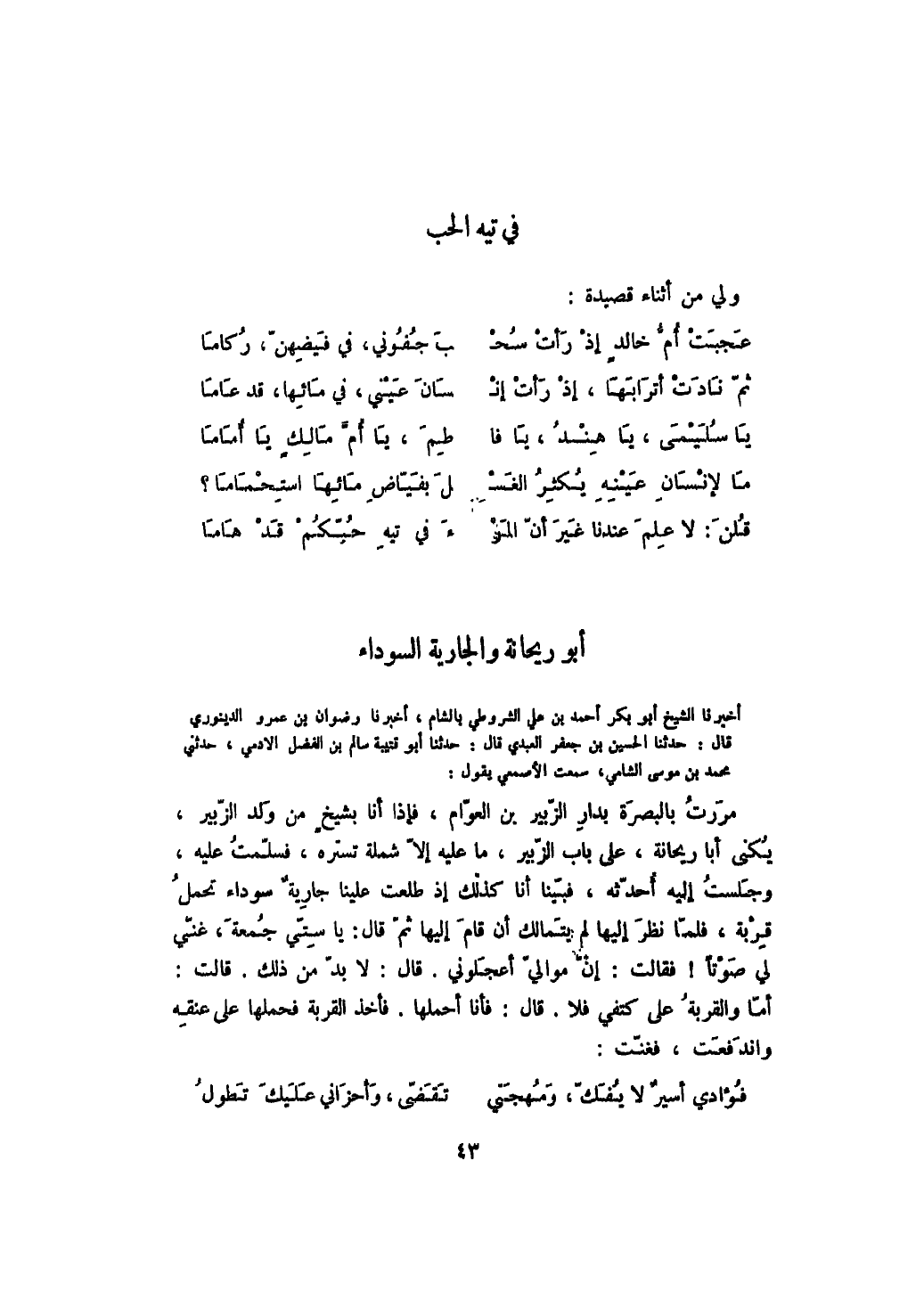 أخبرنا الشيخ أبو بكر أحمد بن علي الشروطي بالشام، أخبرنا رضوان بن عمرو الدينوري قال: حدثنا الحسين بن جعفر العبدي قال: حدثنا أبو قتيبة سالم بن الفضل الأدمي، حدثني محمد بن موسى الشامي، سمعت الأصمعي يقول: مررت بالبصرة بدار الزبير بن العوام، فإذا أنا بشيخ أبو ولد الزبير، يكنى أبا ريحانة، على باب الزبير، ما عليه إلا شملة تستره، فسلمت عليه، وجلست إليه أحدثه، فبينا أنا كذلك إذ طلعت علينا جارية سوداء تحمل قربة، فلما نظر إليها لم يتمالك أن قام إليها ثم قال: يا ستي جمعة، غني لي صوتاً! فقالت: إن مواليّ أعجلوني. قال: لا بد من ذلك. قالت: أما والقربة على كتفي فلا. قال: فأنا أحملها. فأخذ القربة فحملها على عنقه واندفعت، فغنت: