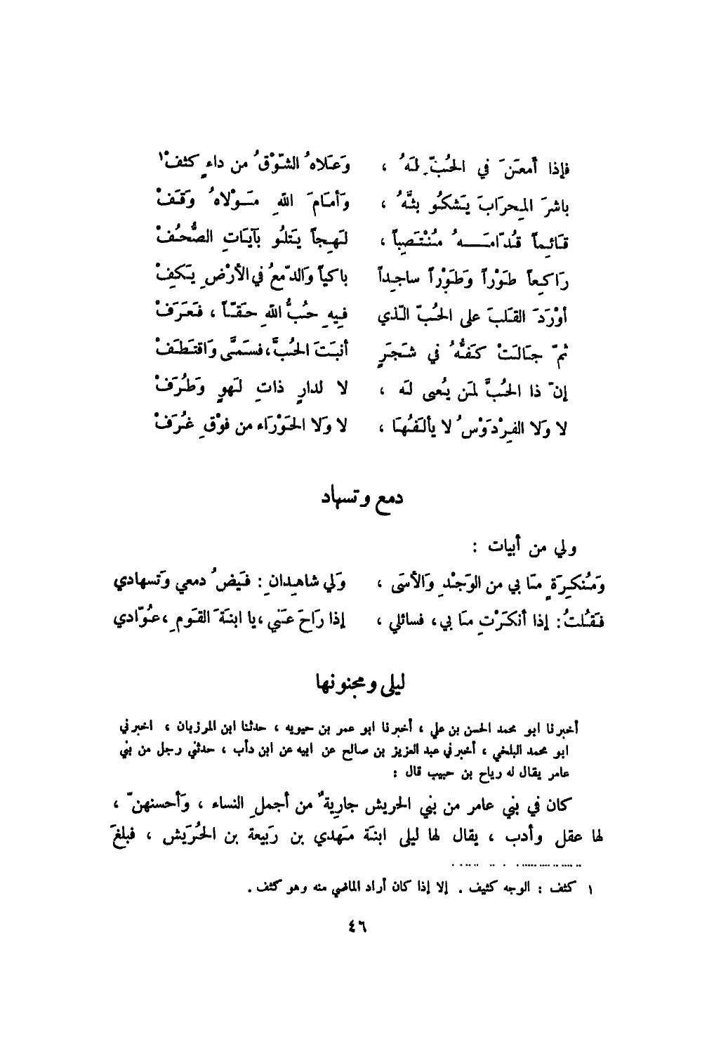 إنّ ذا الحُبَّ لمن يُعى لَه، ... لا لدارٍ ذاتِ لَهوٍ وَطُرَفْ