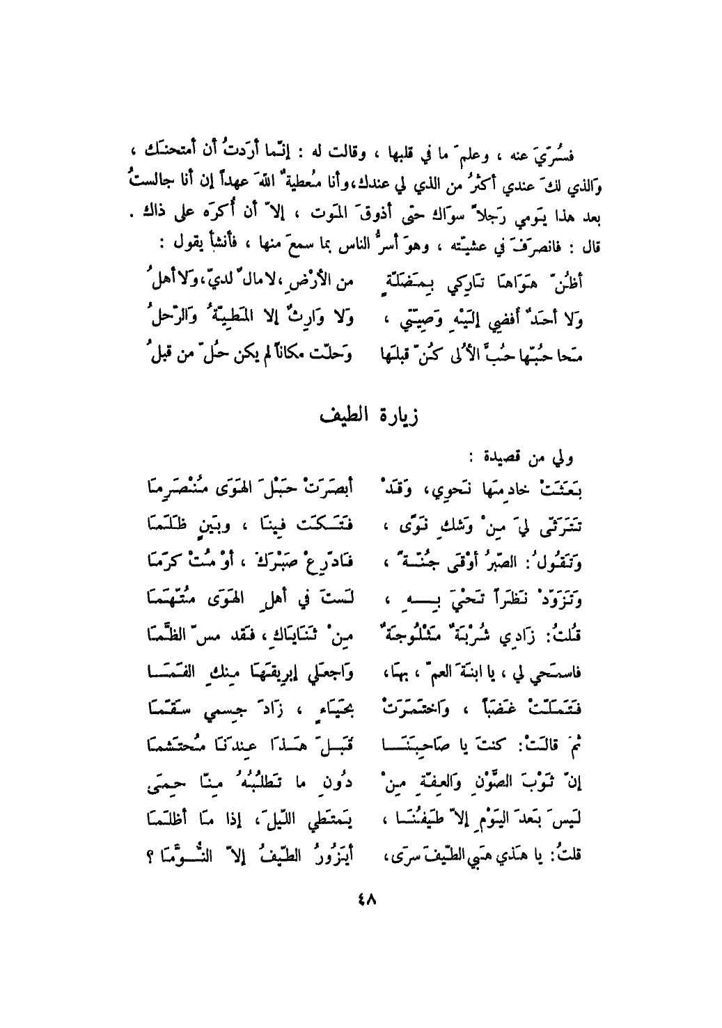 فسري عنه، وعلم ما في قلبها، وقالت له: إنما أردت أن أمتحنك، والذي لك عندي أكثر من الذي لي عندك، وأنا معطية الله عهداً إن أنا جالست بعد هذا يومي رجلاً سواك حتى أذوق الموت، إلا أن أكره على ذاك. قال: فانصرف في عشيته، وهو أسر الناس بما سمع منها، فأنشأ يقول: