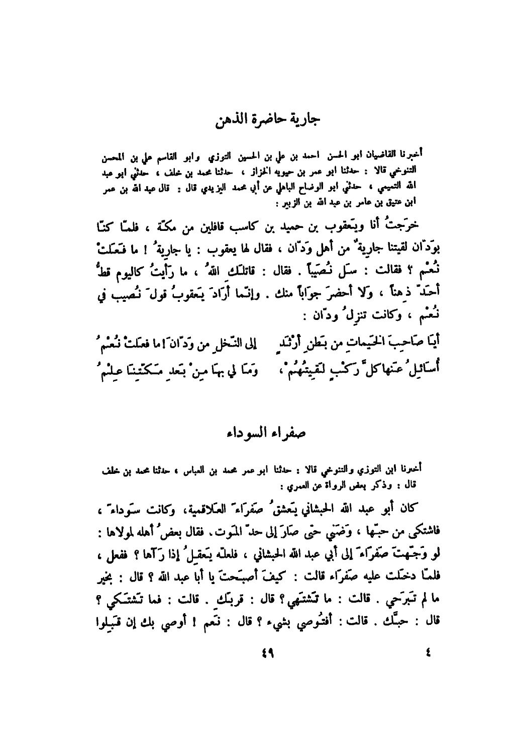 أخبرنا ابن التوزي والتنوخي قالا: حدثنا أبو عمر محمد بن العباس، حدثنا محمد بن خلف قال: وذكر بعض الرواة عن العمري: كان أبو عبد الله الحبشاني يعشق صفراء العلاقمية، وكانت سوداء، فاشتكى من حبها، وضني حتى صار إلى حد الموت، فقال بعض أهله لمولاها: لو وجهت صفراء إلى أبي عبد الله الحبشاني، فلعله يعقل إذا رآها؟ ففعل، فلما دخلت عليه صفراء قالت: كيف أصبحت يا أبا عبد الله؟ قال: بخير ما لم تبرحي. قالت: ما تشتهي؟ قال: قربك. قالت: فما تشتكي؟ قال: حبك. قالت: أفتوصي بشيء؟ قال: نعم! أوصي بك إن قبلوا