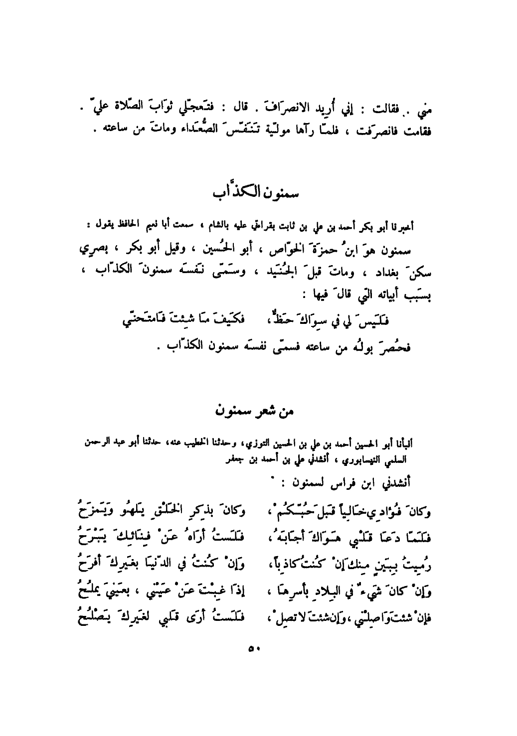 أنبأنا أبو الحسين أحمد بن علي بن الحسين التوزي، وحدثنا الخطيب عنه، حدثنا أبو عبد الرحمن السلمي النيسابوري، أنشدني علي بن أحمد بن جعفر أنشدني ابن فراس لسمنون: