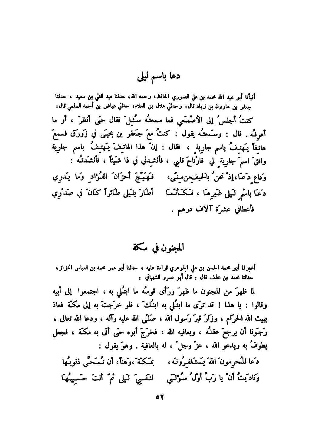 أخبرنا أبو محمد الحسن بن علي الجوهري قراءة عليه، حدثنا أبو عمر محمد بن العباس الخزاز، حدثنا محمد بن خلف قال: قال أبو عمرو الشيباني: لما ظهر من المجنون ما ظهر ورأى قومه ما ابتلي به، اجتمعوا إلى أبيه وقالوا: يا هذا! قد ترى ما ابتلي به ابنك، فلو خرجت به إلى مكة فعاذ ببيت الله الحرام، وزار قبر رسول الله صلى الله عليه وسلم، ودعا الله تعالى، رجونا أن يرجع عقله، ويعافيه الله، فخرج أبوه حتى أتى به مكة، فجعل يطوف به ويدعو الله، عز وجل، له بالعافية. وهو يقول: