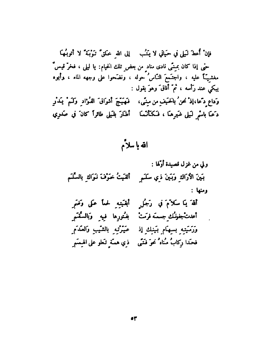 حتى إذا كان بمنىً نادى مناد من بعض تلك الخيام: يا ليلى، فخر قيس مغشياً عليه، واجتمع الناس حوله، ونضحوا على وجهه الماء، وأبوه يبكي عند رأسه، ثم أفاق وهو يقول: