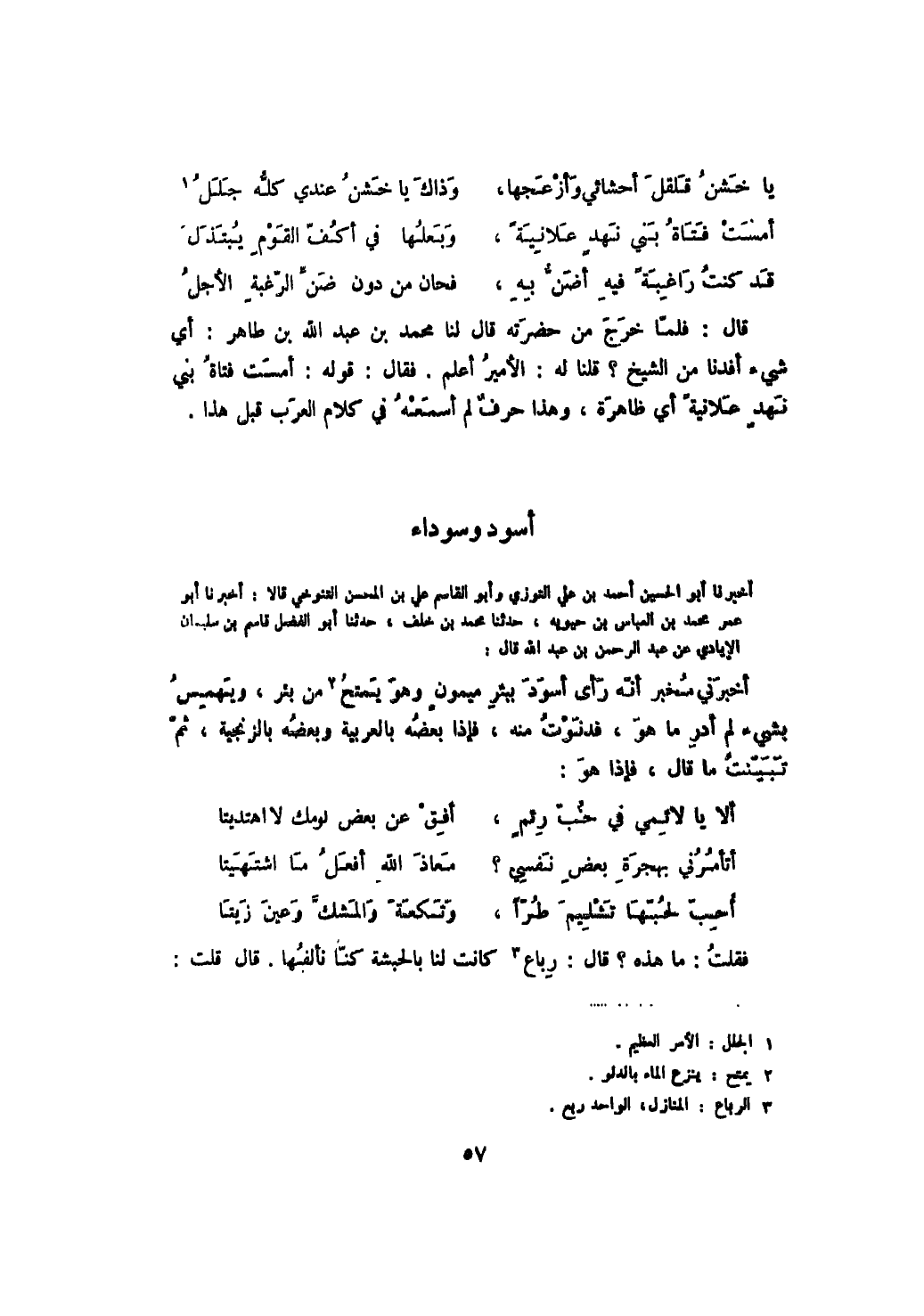 قال: فلما خرج من حضرته قال لنا محمد بن عبد الله بن طاهر: أي شيء أفدنا من الشيخ؟ قلنا له: الأمير أعلم. فقال: قوله: أمست فتاة بني نهد علانيةً أي ظاهرة، وهذا حرف لم أسمعه في كلام العرب قبل هذا.