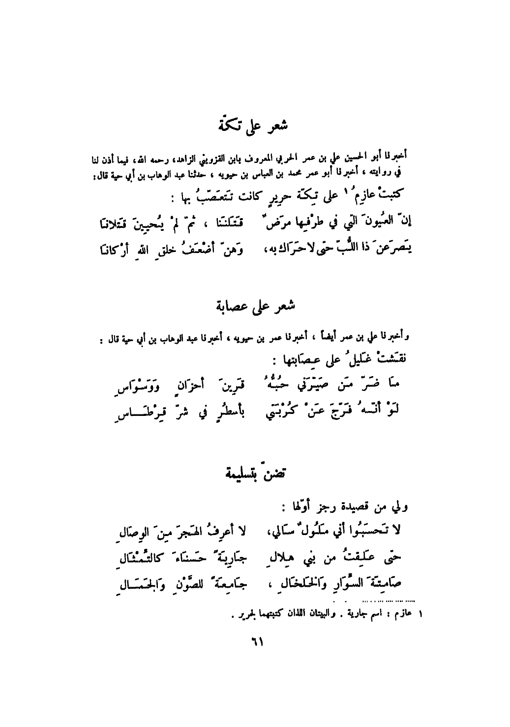 أخبرنا أبو الحسين علي بن عمر الحربي المعروف بابن القزويني الزاهد، رحمه الله تعالى، فيما أذن لنا في روايته، أخبرنا أبو عمر محمد بن العباس بن حيويه، حدثنا عبد الوهاب بن أبي حية قال: كتبت عازم على تكة حرير كانت تتعصب بها: