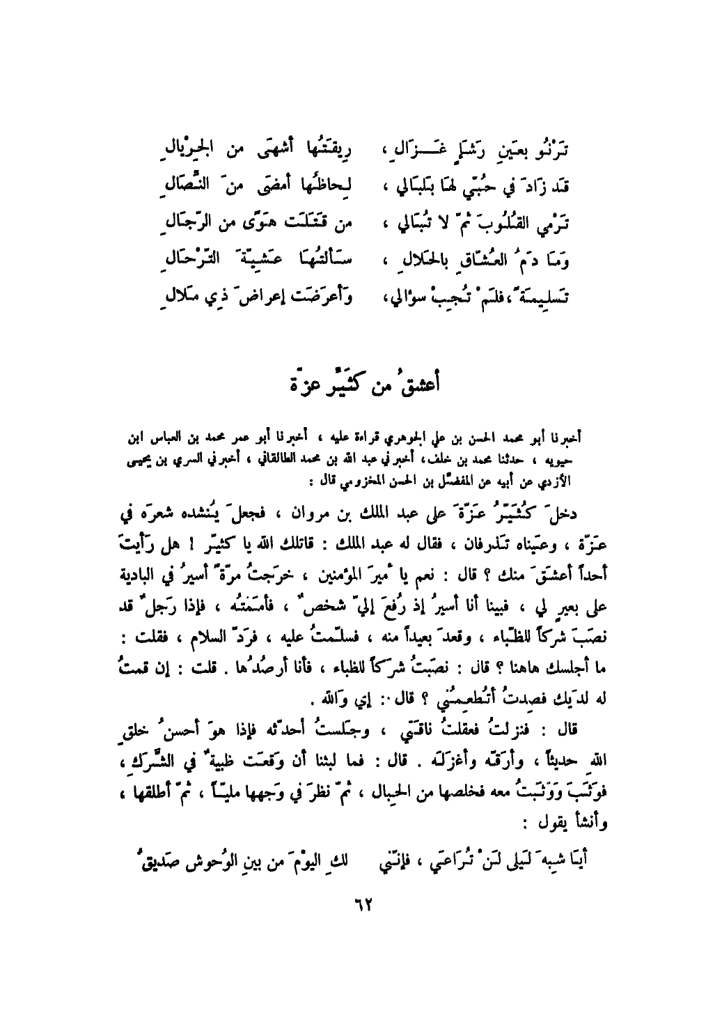 أخبرنا أبو محمد الحسن بن علي الجوهري قراءة عليه، أخبرنا أبو عمر محمد بن العباس بن حيويه، حدثنا محمد بن خلف، أخبرني عبد الله بن محمد الطالقاني، أخبرني السري بن يحيى الأزدي عن أبيه عن المفضل بن الحسن المخزومي قال: دخل كثيِّر عزة على عبد الملك بن مروان، فجعل ينشده شعره في عزة، وعيناه تذرفان، فقال له عبد الملك: قاتلك الله يا كثير! هل رأيت أحداً أعشق منك؟ قال: نعم يا أمير المؤمنين، خرجت مرةً أسير في البادية على بعير لي، فبينا أنا أسير إذ رفع إلي شخص، فأممته، فإذا رجل قد نصب شركاً للظباء، وقعد بعيداً منه، فسلمت عليه، فرد السلام، فقلت: ما أجلسك ها هنا؟ قال: نصبت شركاً للظباء، فأنا أرصدها. قلت: إن قمت له لديك فصدت أتطعمني؟ قال: إي والله.