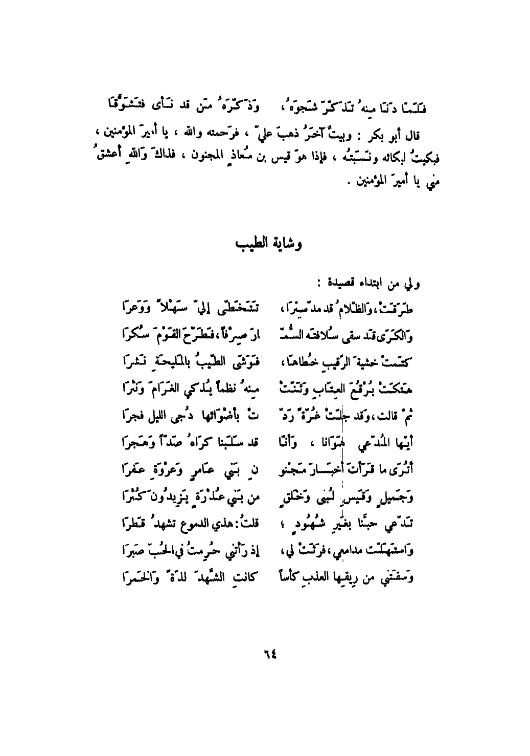 قال أبو بكر: وبيت آخر ذهب علي، فرحمته والله، يا أمير المؤمنين، فبكيت لبكائه ونسبته، فإذا هو قيس بن معاذ المجنون، فذاك والله أعشق مني يا أمير المؤمنين.