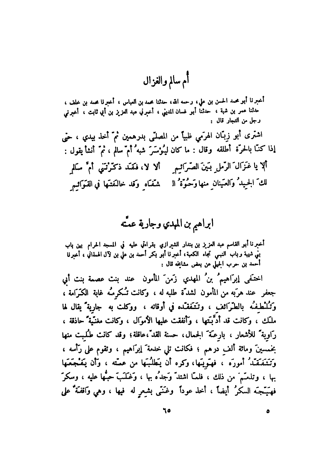 أخبرنا أبو القاسم عبد العزيز بن بندار الشيرازي بقراءتي عليه في المسجد الحرام بين باب بني شيبة وباب النبي تجاه الكعبة، أخبرنا أبو بكر أحمد بن علي بن لآل الهمذاني، أخبرنا أحمد بن حرب الجيلي عن بعض مشايخه قال: اختفي إبراهيم بن المهدي زمن المأمون عند بنت عصمة بنت أبي جعفر عند هربه من المأمون لشدة طلبه له، وكانت تكرمه غاية الكرامة، وتلطفه بالطرائف، وتتفقده في أوقاته، ووكلت به جاريةً يقال لها ملك، وكانت قد أدبتها، وأنفقت عليها الأموال، وكانت مغنيةً حاذقة، راويةً للأشعار، بارعة الجمال، حسنة القد، عاقلة؛ وقد كانت طلبت منها بخمسين ومائة ألف درهم؛ فكانت تلي خدمة إبراهيم، وتقوم على رأسه، وتتفقد أموره، فهويها، وكره أن يطلبها من عمته، وأن يفجعها بها، وتذمم من ذلك، فلما اشتد وجده بها، وغلب حبها عليه، وسكر فهيجه السكر أيضاً، أخذ عوداً وغنى بشعر له فيها، وهي واقفة على