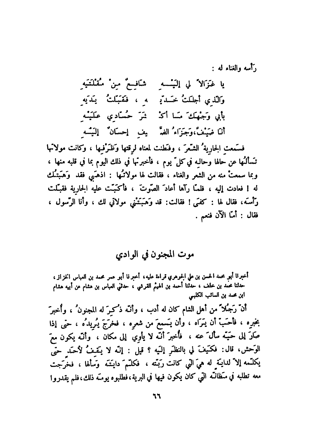 فسمعت الجارية الشعر، وفطنت لمعناه لرقتها وظرفها، وكانت مولاتها تسألها عن حالها وحاله في كل يوم، فأخبرتها في ذلك اليوم بما في قلبه منها، وبما سمعت منه من الشعر والغناء، فقالت لها مولاتها: اذهبي فقد وهبتك له! فعادت إليه، فلما رآها أعاد الصوت، فأكبت عليه الجارية فقبلت رأسه، فقال لها: كفى! فقالت: قد وهبتني مولاتي لك، وأنا الرسول، فقال: أما الآن فنعم.