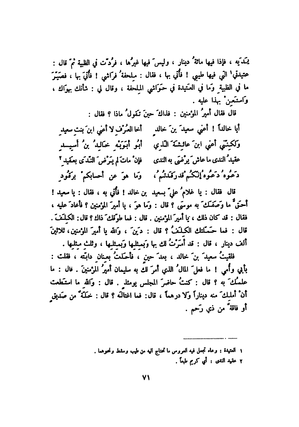 قال: فقال: يا غلام علي بسعيد بن خالد! فأتي به، فقال: يا سعيد! أحق ما وصفك به موسى؟ قال: وما هو، يا أمير المؤمنين؟ فأعاد عليه، فقال: قد كان ذلك، يا أمير المؤمنين. قال: فما طوقك ذاك؟ قال: الكلف. قال: فما حملتك الكلف؟ قال: دين، والله يا أمير المؤمنين، ثلاثين ألف دينار، قال: قد أمرت لك بها وبمثلها وبمثلها، وثلث مثلها.