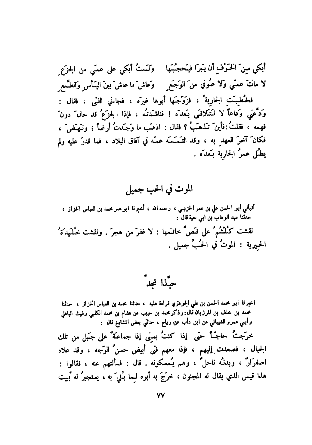 فخطبت الجارية، فزوجها أبوها غيره، فجاءني الفتى، فقال: ودعني وداعاً لا نتلاقى بعده! فناشدته، فإذا الجزع قد حال دون فهمه، فقلت: فأين تذهب؟ فقال: اذهب ما وجدت أرضاً؛ ونهض، فكان آخر العهد به، وقد التمسه عمه في آفاق البلاد، فما قدر عليه ولم يطل عمر الجارية بعده.
