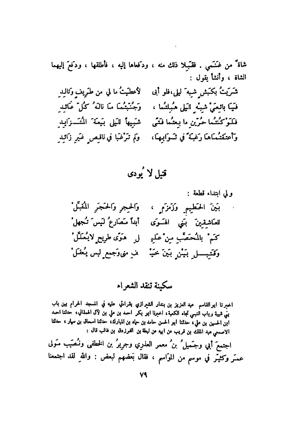 أخبرنا أبو القاسم عبد العزيز بن بندار الشيرازي بقراءتي عليه في المسجد الحرام بين باب بني شيبة وباب النبي تجاه الكعبة، أخبرنا أبو بكر أحمد بن علي بن لآل الهمذاني، حدثنا أحمد بن الحسين بن علي، حدثنا أبو الحسن حامد بن حماد بن المبارك، حدثنا إسحق بن سيار، حدثنا الأصمعي عبد الملك بن قريب عن أبيه عن لبطة بن الفرزدق بن غالب قال: