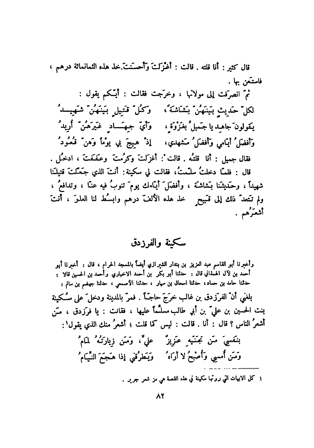 فقال جميل: أنا قلته. قالت: أغزلت وكرمت وعففت، ادخل. قال: فلما دخلت سلمت، فقالت لي سكينة: أنت الذي جعلت قتيلنا شهيداً. وحديثنا بشاشة، وأفضل أيامك يوم تنوب فيه عنا، وتدافع، ولم تتعد ذلك إلى قبيح خذ هذه الألف درهم وابسط لنا العذر، أنت أشعرهم.