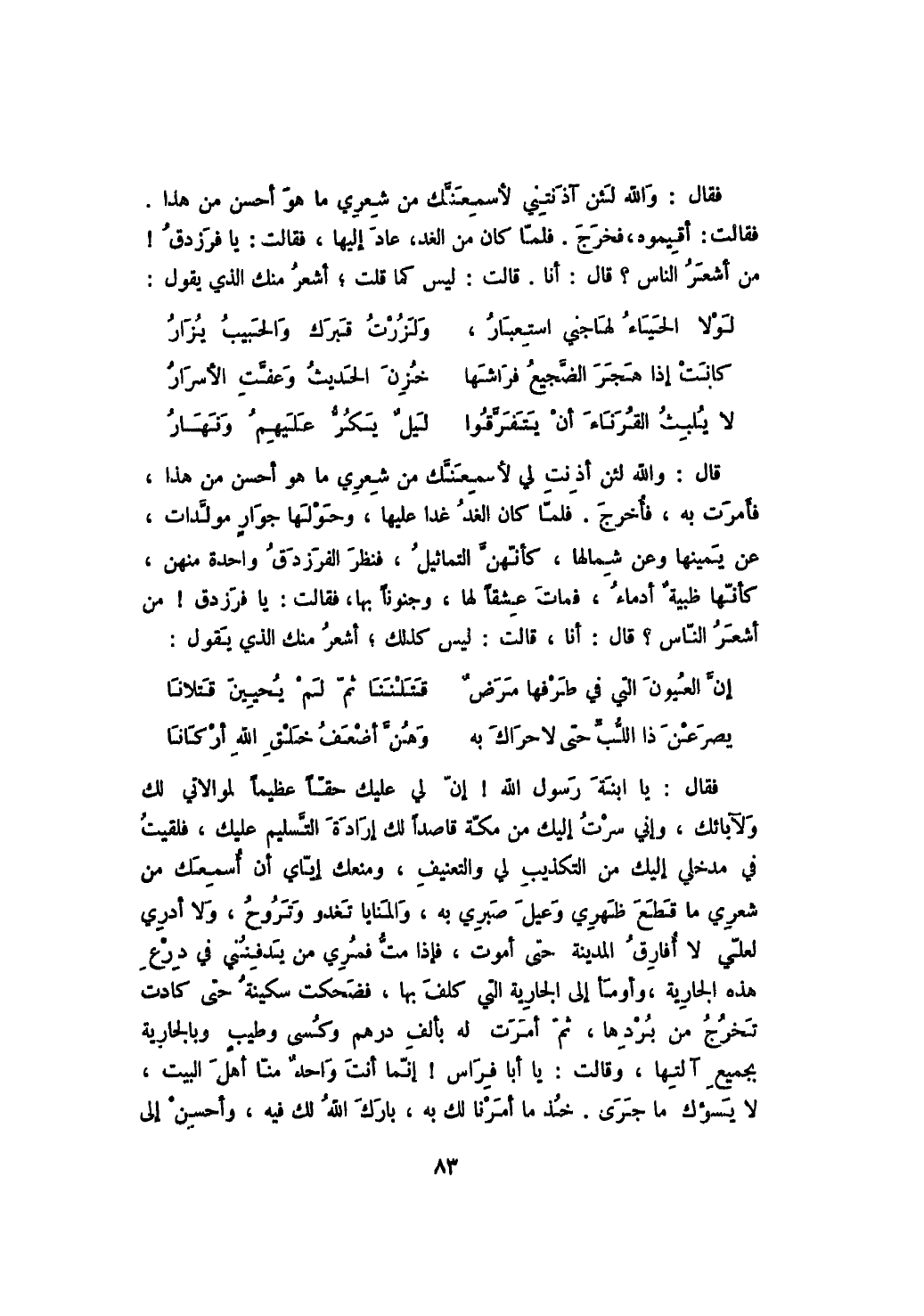 فقال: والله لئن آذنتني لأسمعنك من شعري ما هو أحسن من هذا. فقالت: أقيموه، فخرج. فلما كان من الغد، عاد إليها، فقالت: يا فرزدق! من أشعر الناس؟ قال: أنا. قالت: ليس كما قلت؛ أشعر منك الذي يقول: