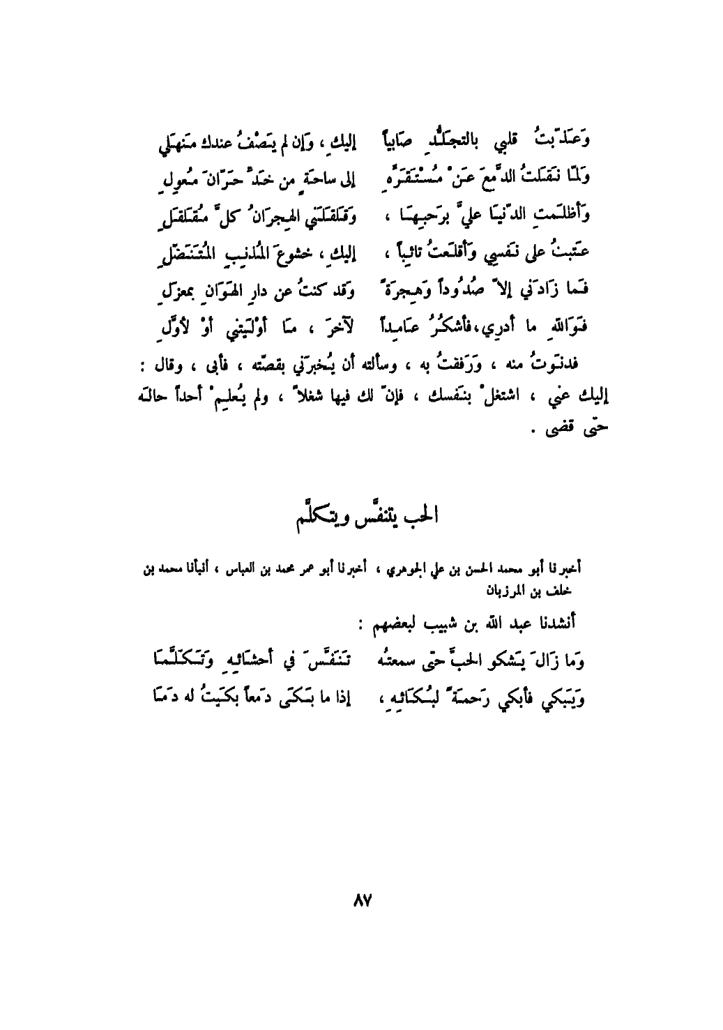 أخبرنا أبو محمد الحسن بن علي الجوهري، أخبرنا أبو عمر محمد بن العباس، أنبأنا محمد بن خلف بن المرزبان أنشدنا عبد الله بن شبيب لبعضهم: